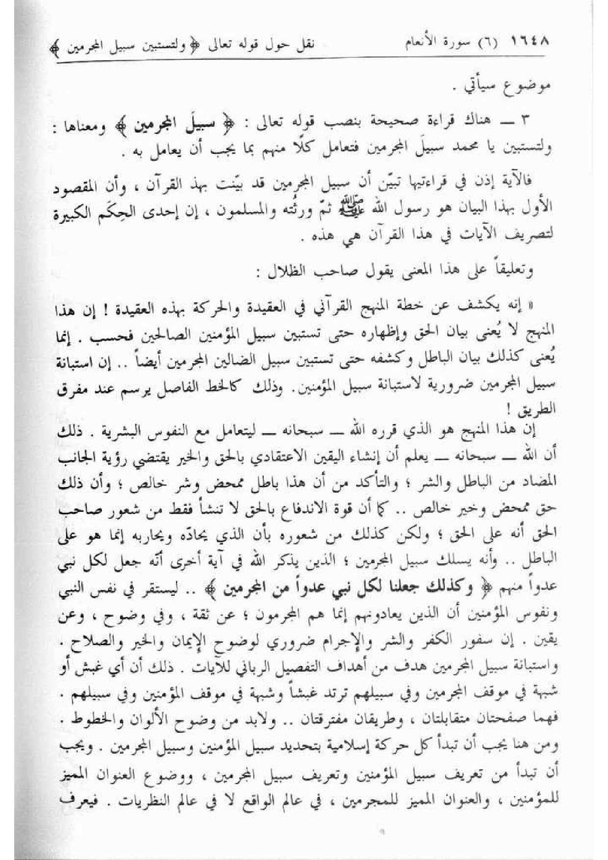 «إنه يكشف عن خطة المنهج القرآني في العقيدة والحركة بهذه العقيدة! إن هذا المنهج لا يعنى بيان الحق وإظهاره حتى تستبين سبيل المؤمنين الصالحين فحسب. إنما يعنى كذلك بيان الباطل وكشفه حتى تستبين سبيل الضالين المجرمين أيضا .. إن استبانة سبيل المجرمين ضرورية لاستبانة سبيل المؤمنين. وذلك كالخط الفاصل يرسم عند مفرق الطريق!