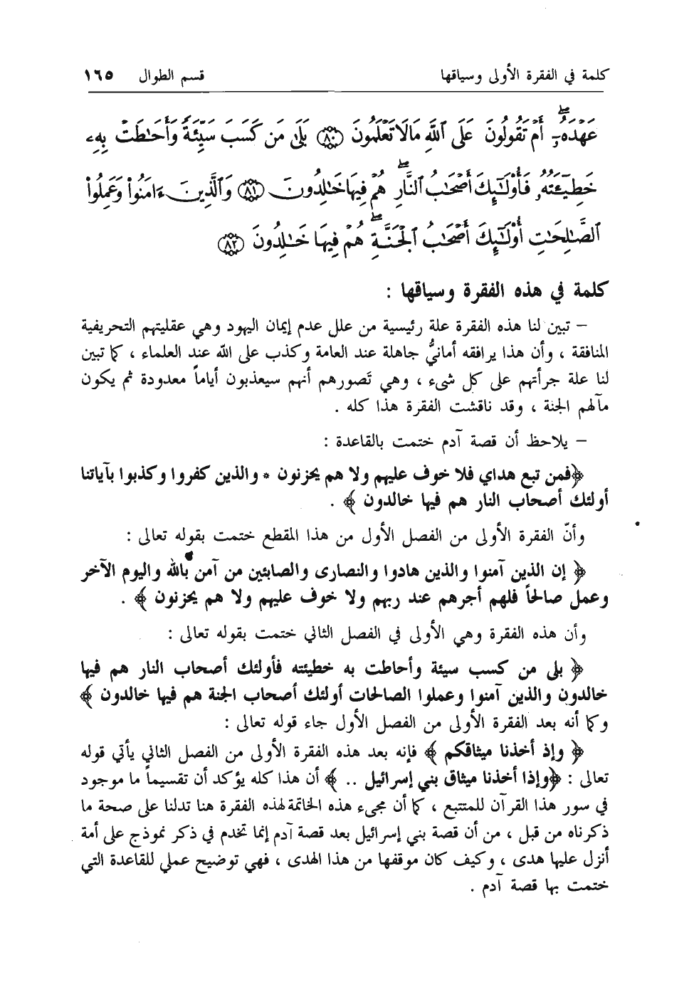 وَإِذْ أَخَذْنا مِيثاقَكُمْ فإنه بعد هذه الفقرة الأولى من الفصل الثاني يأتي قوله تعالى: وَإِذْ أَخَذْنا مِيثاقَ بَنِي إِسْرائِيلَ .. أن هذا كله يؤكد أن تقسيما ما موجود في سور هذا القرآن للمتتبع، كما أن مجئ هذه الخاتمة لهذه الفقرة هنا تدلنا على صحة ما ذكرناه من قبل، من أن قصة بني إسرائيل بعد قصة آدم إنما تخدم في ذكر نموذج على أمة أنزل عليها هدى، وكيف كان موقفها من هذا الهدى، فهي توضيح عملي للقاعدة التي ختمت بها قصة آدم.