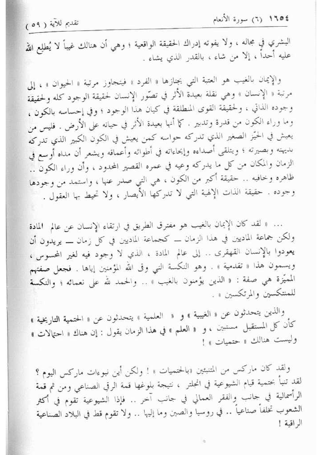 ... «لقد كان الإيمان بالغيب هو مفترق الطريق في ارتقاء الإنسان عن عالم المادة ولكن جماعة الماديين في هذا الزمان- كجماعة الماديين في كل زمان- يريدون أن يعودوا بالإنسان القهقرى .. إلى عالم المادة، الذي لا وجود فيه لغير المحسوس، ويسمون هذا «تقدمية». وهو النكسة التي وقى الله المؤمنين إياها. فجعل صفتهم المميّزة هي صفة: «الذين يؤمنون بالغيب» .. والحمد لله على نعمائه؛ والنكسة للمنتكسين والمرتكسين».