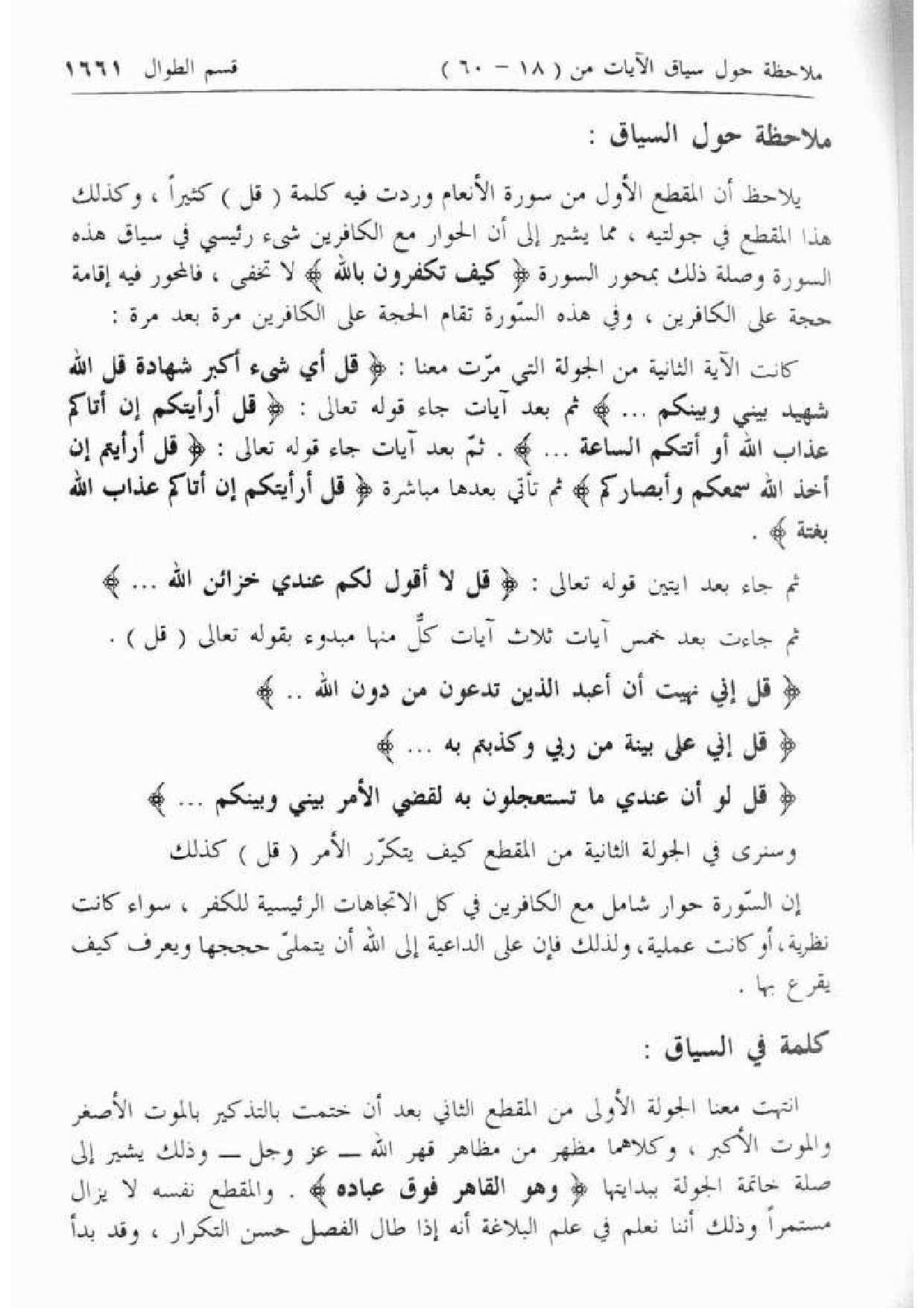 يلاحظ أن المقطع الأول من سورة الأنعام وردت فيه كلمة (قل) كثيرا، وكذلك هذا المقطع في جولتيه، مما يشير إلى أن الحوار مع الكافرين شئ رئيسي في سياق هذه السورة وصلة ذلك بمحور السورة كَيْفَ تَكْفُرُونَ بِاللَّهِ لا تخفى، فالمحور فيه إقامة حجة على الكافرين، وفي هذه السّورة تقام الحجة على الكافرين مرة بعد مرة: