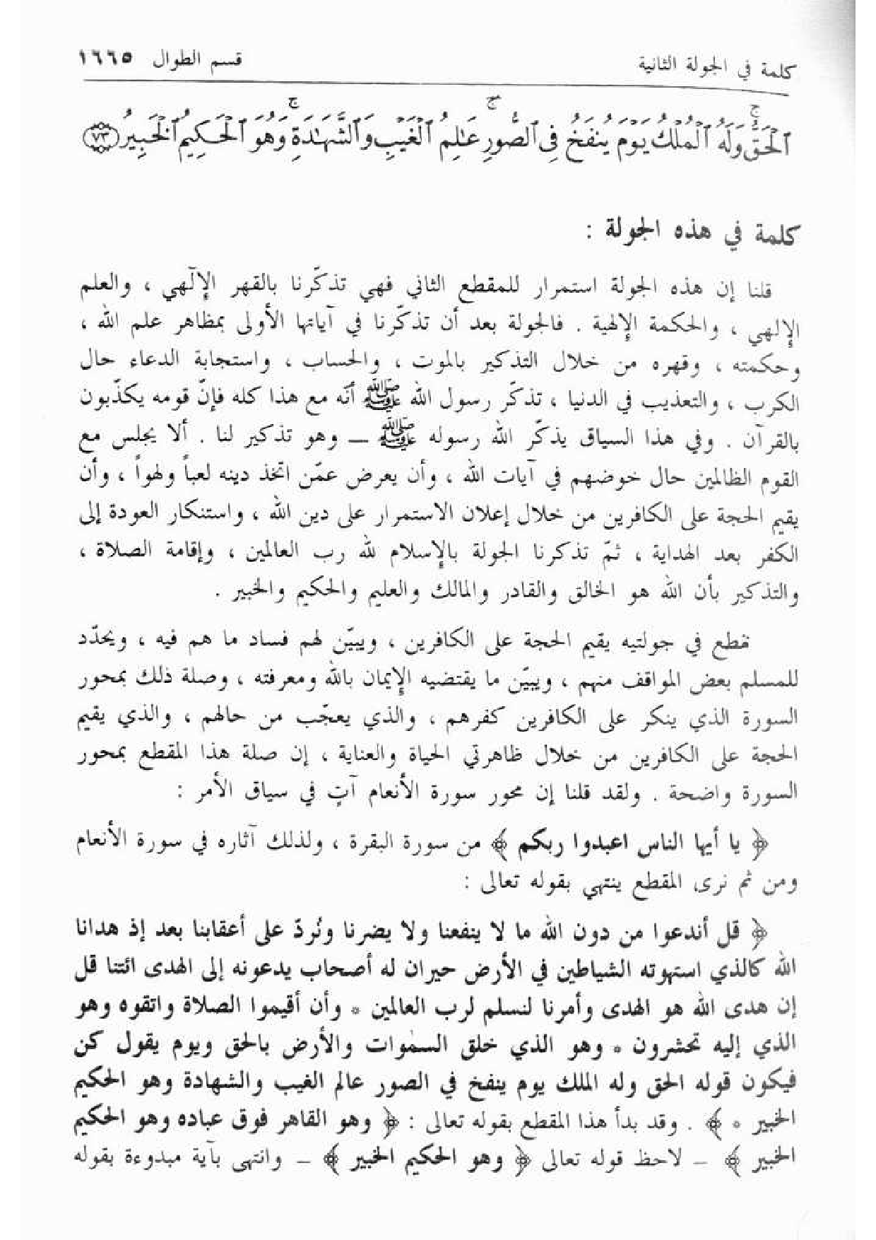 قُلْ أَنَدْعُوا مِنْ دُونِ اللَّهِ ما لا يَنْفَعُنا وَلا يَضُرُّنا وَنُرَدُّ عَلى أَعْقابِنا بَعْدَ إِذْ هَدانَا اللَّهُ كَالَّذِي اسْتَهْوَتْهُ الشَّياطِينُ فِي الْأَرْضِ حَيْرانَ لَهُ أَصْحابٌ يَدْعُونَهُ إِلَى الْهُدَى ائْتِنا قُلْ إِنَّ هُدَى اللَّهِ هُوَ الْهُدى وَأُمِرْنا لِنُسْلِمَ لِرَبِّ الْعالَمِينَ* وَأَنْ أَقِيمُوا الصَّلاةَ وَاتَّقُوهُ وَهُوَ الَّذِي إِلَيْهِ تُحْشَرُونَ* وَهُوَ الَّذِي خَلَقَ السَّماواتِ وَالْأَرْضَ بِالْحَقِّ وَيَوْمَ يَقُولُ كُنْ فَيَكُونُ قَوْلُهُ الْحَقُّ وَلَهُ الْمُلْكُ يَوْمَ يُنْفَخُ فِي الصُّورِ عالِمُ الْغَيْبِ وَالشَّهادَةِ وَهُوَ الْحَكِيمُ الْخَبِيرُ*. وقد بدأ هذا المقطع بقوله تعالى: وَهُوَ الْقاهِرُ فَوْقَ عِبادِهِ وَهُوَ الْحَكِيمُ الْخَبِيرُ- لاحظ قوله تعالى وَهُوَ الْحَكِيمُ الْخَبِيرُ- وانتهى بآية مبدوءة بقوله