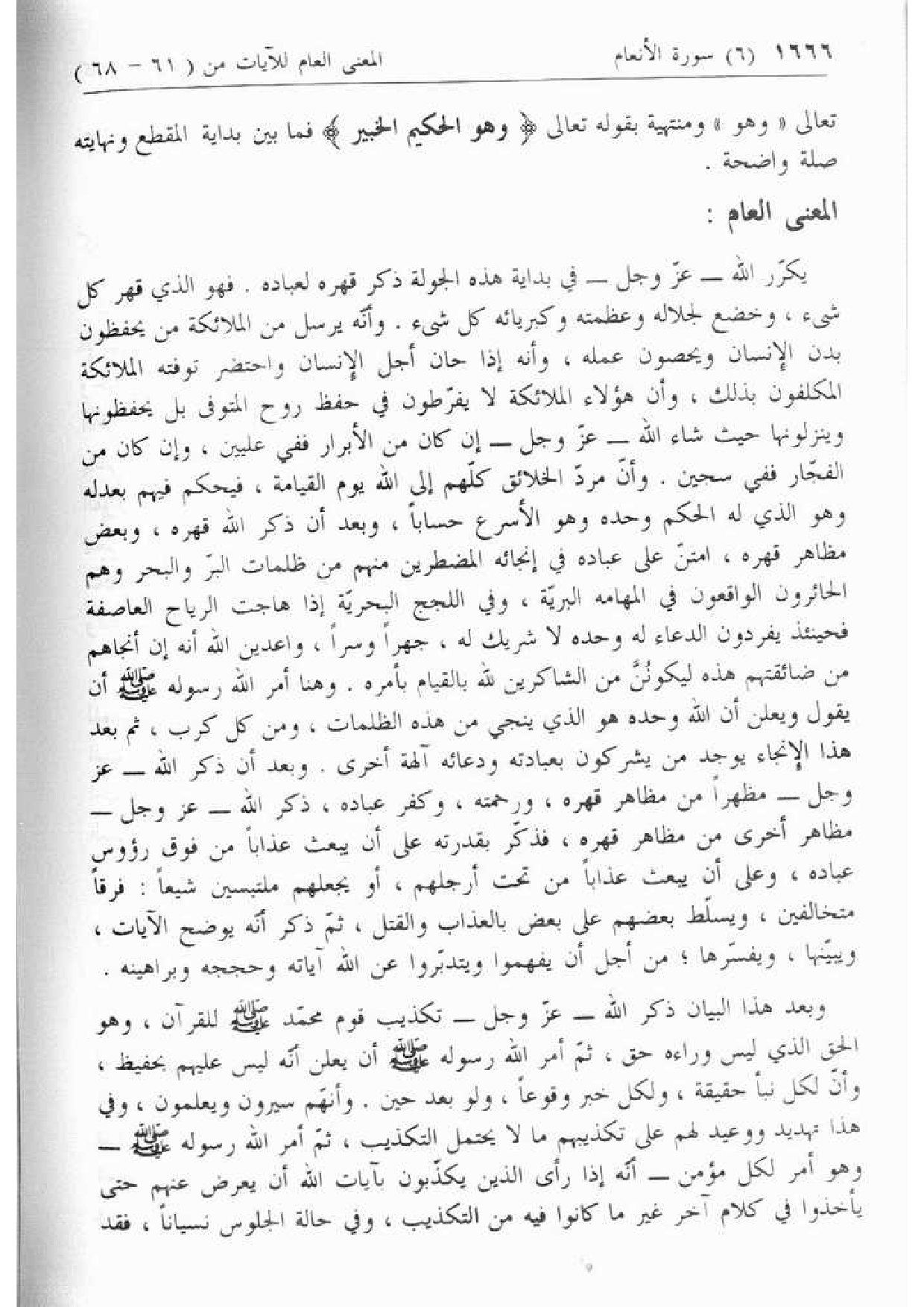 يكرّر الله- عزّ وجل- في بداية هذه الجولة ذكر قهره لعباده. فهو الذي قهر كل شئ، وخضع لجلاله وعظمته وكبريائه كل شئ. وأنّه يرسل من الملائكة من يحفظون بدن الإنسان ويحصون عمله، وأنه إذا حان أجل الإنسان واحتضر توفته الملائكة المكلفون بذلك، وأن هؤلاء الملائكة لا يفرّطون في حفظ روح المتوفى بل يحفظونها وينزلونها حيث شاء الله- عزّ وجل- إن كان من الأبرار ففي عليين، وإن كان من الفجّار ففي سجين. وأنّ مردّ الخلائق كلّهم إلى الله يوم القيامة، فيحكم فيهم بعدله وهو الذي له الحكم وحده وهو الأسرع حسابا، وبعد أن ذكر الله قهره، وبعض مظاهر قهره، امتنّ على عباده في إنجائه المضطرين منهم من ظلمات البرّ والبحر وهم الحائرون الواقعون في المهامة البريّة، وفي اللجج البحريّة إذا هاجت الرياح العاصفة فحينئذ يفردون الدعاء له وحده لا شريك له، جهرا وسرا، واعدين الله أنه إن أنجاهم من ضائقتهم هذه ليكوننّ من الشاكرين لله بالقيام بأمره. وهنا أمر الله رسوله صلّى الله عليه وسلّم أن يقول ويعلن أن الله وحده هو الذي ينجي من هذه الظلمات، ومن كل كرب، ثم بعد هذا الإنجاء يوجد من يشركون بعبادته ودعائه آلهة أخرى. وبعد أن ذكر الله- عزّ وجل- مظهرا من مظاهر قهره، ورحمته، وكفر عباده، ذكر الله- عزّ وجل- مظاهر أخرى من مظاهر قهره، فذكّر بقدرته على أن يبعث عذابا من فوق رءوس عباده، وعلى أن يبعث عذابا من تحت أرجلهم، أو يجعلهم ملتبسين شيعا: فرقا متخالفين، ويسلّط بعضهم على بعض بالعذاب والقتل، ثمّ ذكر أنّه يوضح الآيات، ويبيّنها، ويفسّرها؛ من أجل أن يفهموا ويتدبّروا عن الله آياته وحججه وبراهينه.