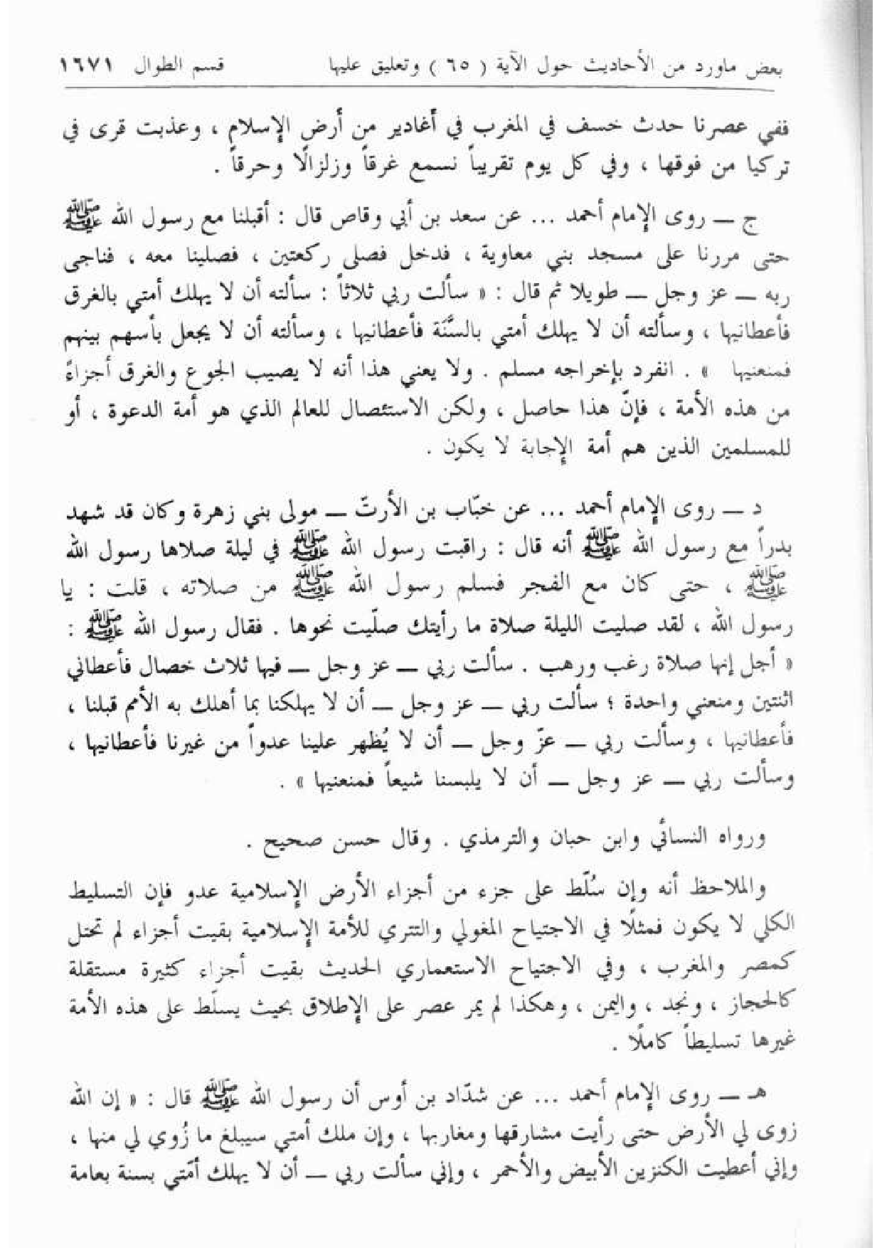 ج- روى الإمام أحمد ... عن سعد بن أبي وقاص قال: أقبلنا مع رسول الله صلّى الله عليه وسلّم حتى مررنا على مسجد بني معاوية، فدخل فصلى ركعتين، فصلينا معه، فناجى ربه- عزّ وجل- طويلا ثم قال: «سألت ربي ثلاثا: سألته أن لا يهلك أمتي بالغرق فأعطانيها، وسألته أن لا يهلك أمتي بالسّنة فأعطانيها، وسألته أن لا يجعل بأسهم بينهم فمنعنيها». انفرد بإخراجه مسلم. ولا يعني هذا أنه لا يصيب الجوع والغرق أجزاء من هذه الأمة، فإنّ هذا حاصل، ولكن الاستئصال للعالم الذي هو أمة الدعوة، أو للمسلمين الذين هم أمة الإجابة لا يكون.