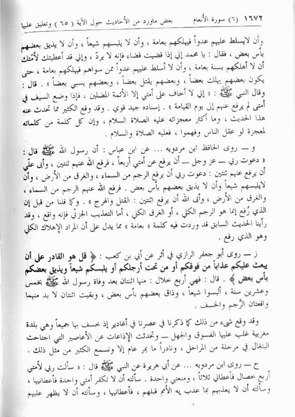 ز- روى أبو جعفر الرازي في أثر عن أبي بن كعب: قُلْ هُوَ الْقادِرُ عَلى أَنْ يَبْعَثَ عَلَيْكُمْ عَذاباً مِنْ فَوْقِكُمْ أَوْ مِنْ تَحْتِ أَرْجُلِكُمْ أَوْ يَلْبِسَكُمْ شِيَعاً وَيُذِيقَ بَعْضَكُمْ بَأْسَ بَعْضٍ. قال: فهي أربع خلال: منها اثنتان بعد وفاة رسول الله صلّى الله عليه وسلّم بخمس وعشرين سنة، ألبسوا شيعا، وذاق بعضهم بأس بعض، وبقيت اثنتان لا بد منهما واقعتان الرّجم والخسف.