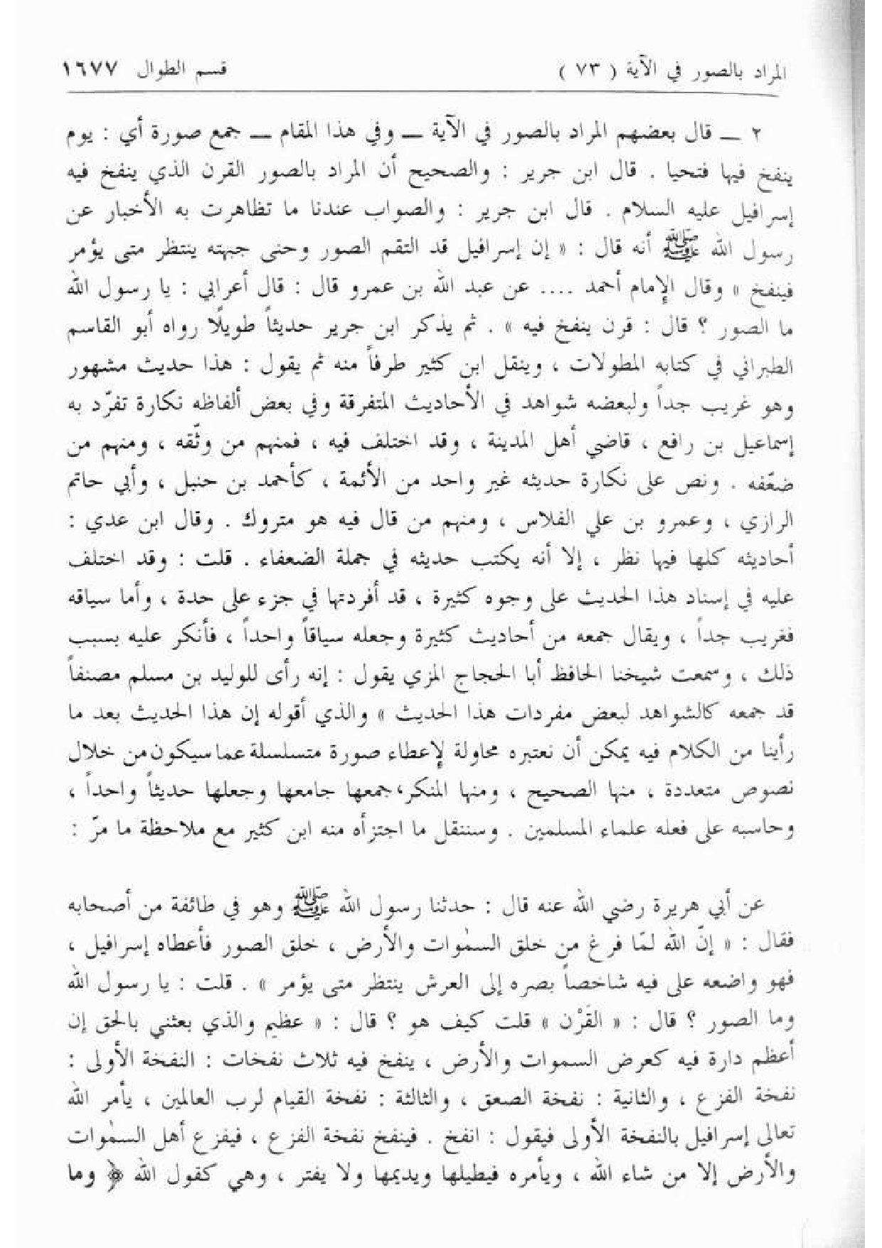قال بعضهم المراد بالصور في الآية- وفي هذا المقام- جمع صورة أي: يوم ينفخ فيها فتحيا. قال ابن جرير: والصحيح أن المراد بالصور القرن الذي ينفخ فيه إسرافيل عليه السلام. قال ابن جرير: والصواب عندنا ما تظاهرت به الأخبار عن رسول الله صلّى الله عليه وسلّم أنه قال: «إن إسرافيل قد التقم الصور وحنى جبهته ينتظر متى يؤمر فينفخ» وقال الإمام أحمد .... عن عبد الله بن عمرو قال: قال أعرابي: يا رسول الله ما الصور؟ قال: قرن ينفخ فيه». ثم يذكر ابن جرير حديثا طويلا رواه أبو القاسم الطبراني في كتابه المطولات، وينقل ابن كثير طرفا منه ثم يقول: هذا حديث مشهور وهو غريب جدا ولبعضه شواهد في الأحاديث المتفرقة وفي بعض ألفاظه نكارة تفرّد به إسماعيل بن رافع، قاضي أهل المدينة، وقد اختلف فيه، فمنهم من وثّقه، ومنهم من ضعّفه. ونص على نكارة حديثه غير واحد من الأئمة، كأحمد بن حنبل، وأبي حاتم الرازي، وعمرو بن علي الفلاس، ومنهم من قال فيه هو متروك. وقال ابن عدي:
