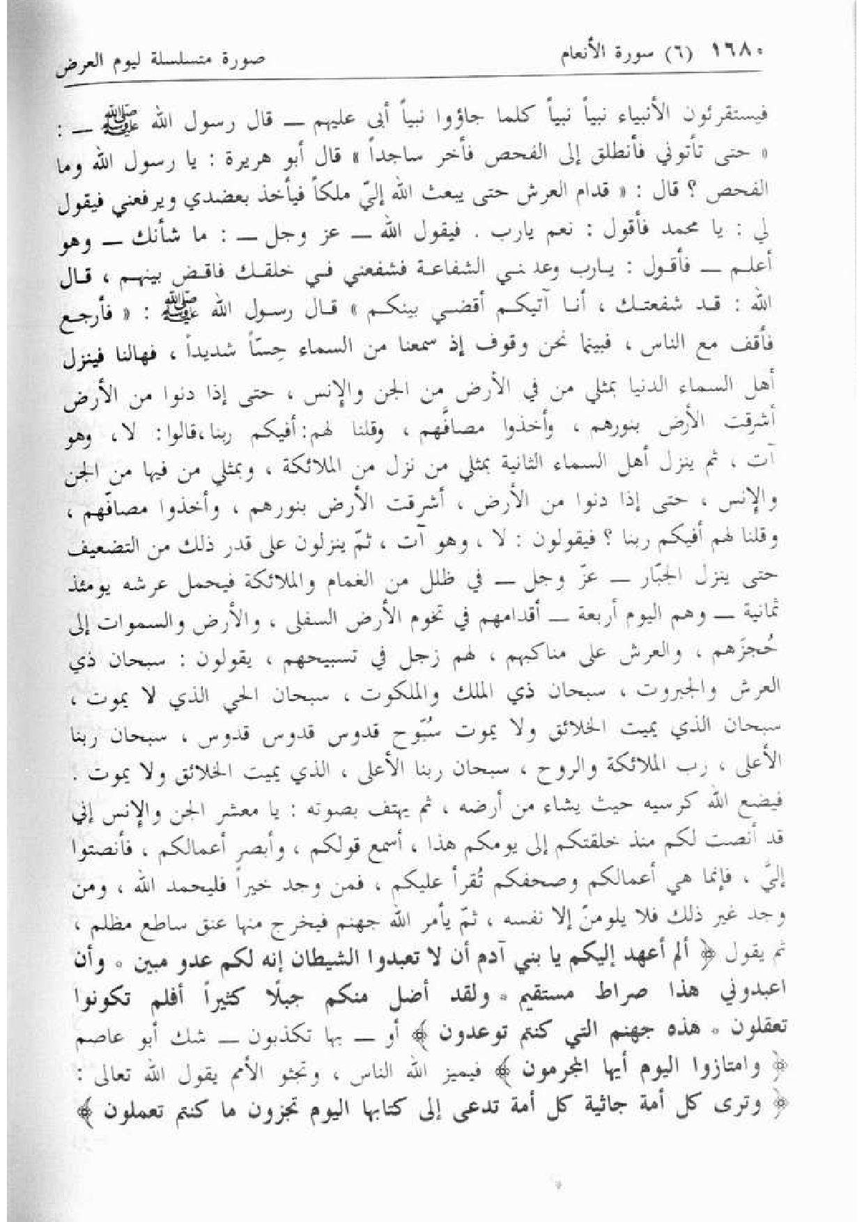 فيضع الله كرسيه حيث يشاء من أرضه، ثم يهتف بصوته: يا معشر الجن والإنس إني قد أنصت لكم منذ خلقتكم إلى يومكم هذا، أسمع قولكم، وأبصر أعمالكم، فأنصتوا إليّ، فإنما هي أعمالكم وصحفكم تقرأ عليكم، فمن وجد خيرا فليحمد الله، ومن وجد غير ذلك فلا يلومنّ إلا نفسه، ثمّ يأمر الله جهنم فيخرج منها عنق ساطع مظلم، ثم يقول أَلَمْ أَعْهَدْ إِلَيْكُمْ يا بَنِي آدَمَ أَنْ لا تَعْبُدُوا الشَّيْطانَ إِنَّهُ لَكُمْ عَدُوٌّ مُبِينٌ* وَأَنِ اعْبُدُونِي هذا صِراطٌ مُسْتَقِيمٌ* وَلَقَدْ أَضَلَّ مِنْكُمْ جِبِلًّا كَثِيراً أَفَلَمْ تَكُونُوا تَعْقِلُونَ* هذِهِ جَهَنَّمُ الَّتِي كُنْتُمْ تُوعَدُونَ أو- بها تكذبون- شك أبو عاصم وَامْتازُوا الْيَوْمَ أَيُّهَا الْمُجْرِمُونَ فيميز الله الناس، وتجثو الأمم يقول الله تعالى:
