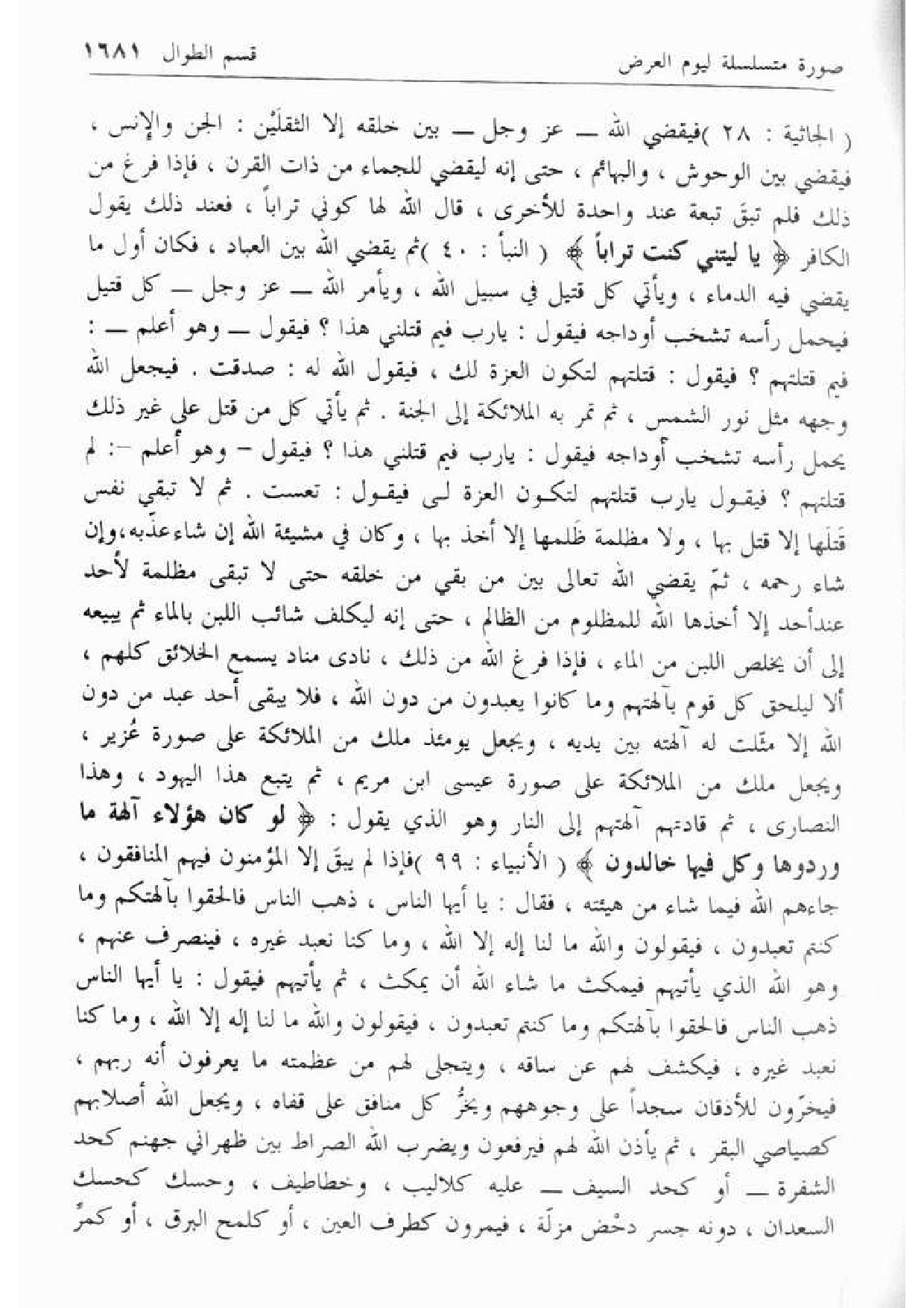 فيم قتلتهم؟ فيقول: قتلتهم لتكون العزة لك، فيقول الله له: صدقت. فيجعل الله وجهه مثل نور الشمس، ثم تمر به الملائكة إلى الجنة. ثم يأتي كل من قتل على غير ذلك يحمل رأسه تشخب أوداجه فيقول: يا رب فيم قتلني هذا؟ فيقول- وهو أعلم-: لم قتلتهم؟ فيقول يا رب قتلتهم لتكون العزة لى فيقول: تعست. ثم لا تبقي نفس قتلها إلا قتل بها، ولا مظلمة ظلمها إلا أخذ بها، وكان في مشيئة الله إن شاء عذّبه، وإن شاء رحمه، ثمّ يقضي الله تعالى بين من بقي من خلقه حتى لا تبقى مظلمة لأحد عند أحد إلا أخذها الله للمظلوم من الظالم، حتى إنه ليكلف شائب اللبن بالماء ثم يبيعه إلى أن يخلص اللبن من الماء، فإذا فرغ الله من ذلك، نادى مناد يسمع الخلائق كلهم، ألا ليلحق كل قوم بآلهتهم وما كانوا يعبدون من دون الله، فلا يبقى أحد عبد من دون الله إلا مثّلت له آلهته بين يديه، ويجعل يومئذ ملك من الملائكة على صورة عزير، ويجعل ملك من الملائكة على صورة عيسى ابن مريم، ثم يتبع هذا اليهود، وهذا النصارى، ثم قادتهم آلهتهم إلى النار وهو الذي يقول: لَوْ كانَ هؤُلاءِ آلِهَةً ما وَرَدُوها وَكُلٌّ فِيها خالِدُونَ (الأنبياء: 99) فإذا لم يبق إلا المؤمنون فيهم المنافقون، جاءهم الله فيما شاء من هيئته، فقال: يا أيها الناس، ذهب الناس فالحقوا بآلهتكم وما كنتم تعبدون، فيقولون والله ما لنا إله إلا الله، وما كنا نعبد غيره، فينصرف عنهم، وهو الله الذي يأتيهم فيمكث ما شاء الله أن يمكث، ثم يأتيهم فيقول: يا أيها الناس ذهب الناس فالحقوا بآلهتكم وما كنتم تعبدون، فيقولون والله ما لنا إله إلا الله، وما كنا نعبد غيره، فيكشف لهم عن ساقه، ويتجلى لهم من عظمته ما يعرفون أنه ربهم، فيخرّون للأذقان سجدا على وجوههم ويخرّ كل منافق على قفاه، ويجعل الله أصلابهم كصياصي البقر، ثم يأذن الله لهم فيرفعون ويضرب الله الصراط بين ظهراني جهنم كحد الشفرة- أو كحد السيف- عليه كلاليب، وخطاطيف، وحسك كحسك السعدان، دونه جسر دحض مزلّة، فيمرون كطرف العين، أو كلمح البرق، أو كمرّ