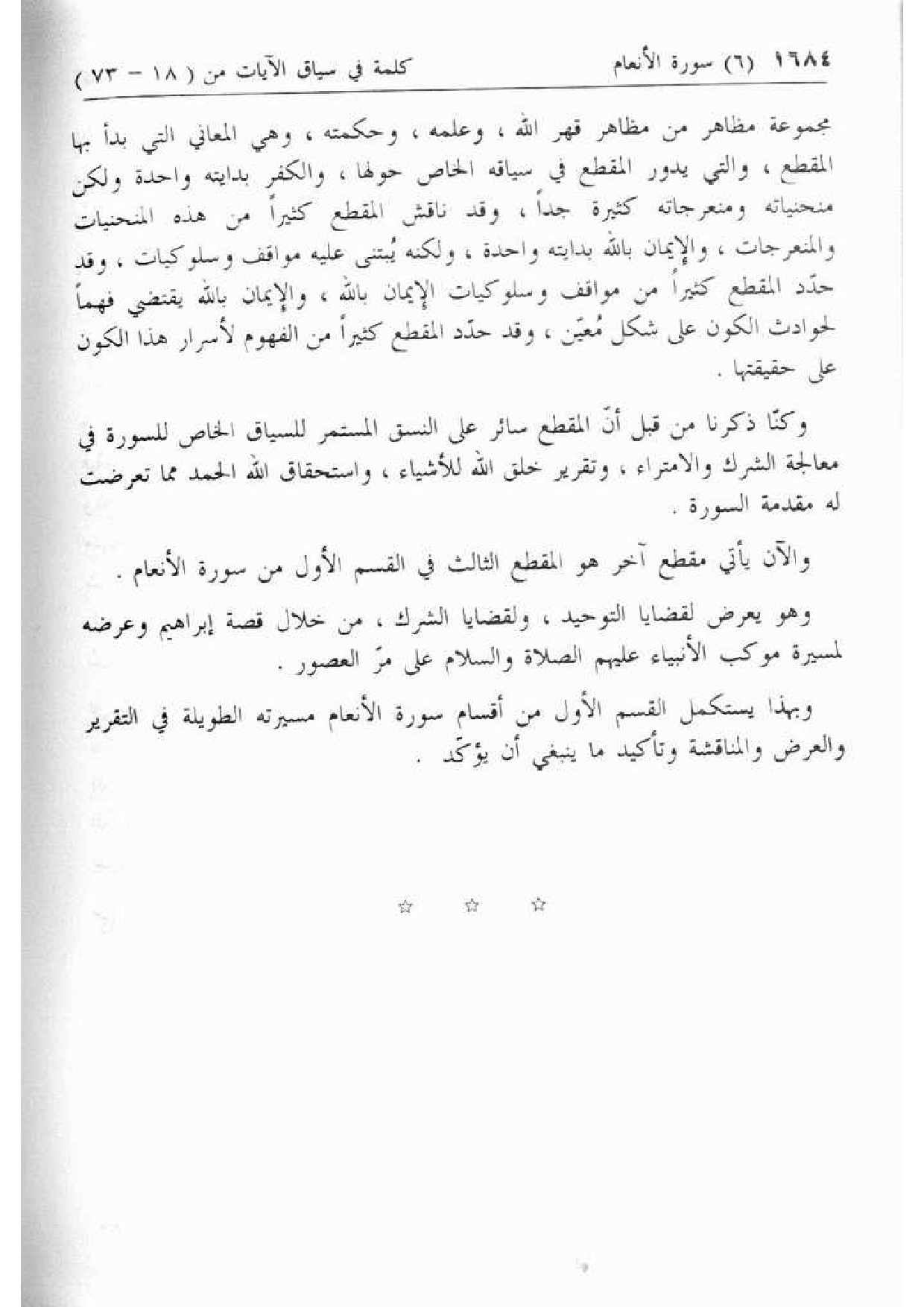 وبهذا يستكمل القسم الأول من أقسام سورة الأنعام مسيرته الطويلة في التقرير والعرض والمناقشة وتأكيد ما ينبغي أن يؤكّد.