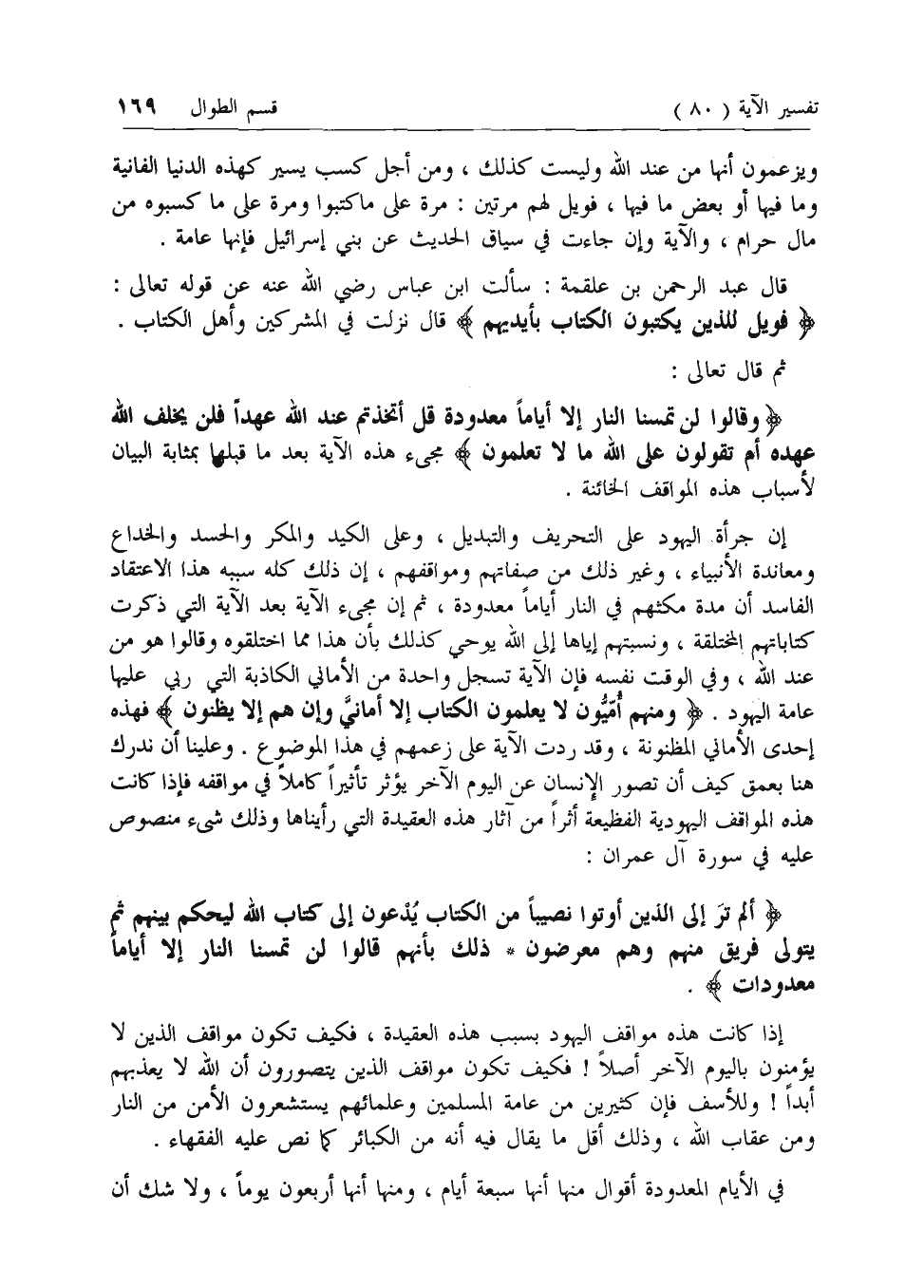 وَقالُوا لَنْ تَمَسَّنَا النَّارُ إِلَّا أَيَّاماً مَعْدُودَةً قُلْ أَتَّخَذْتُمْ عِنْدَ اللَّهِ عَهْداً فَلَنْ يُخْلِفَ اللَّهُ عَهْدَهُ أَمْ تَقُولُونَ عَلَى اللَّهِ ما لا تَعْلَمُونَ مجئ هذه الآية بعد ما قبلها بمثابة البيان لأسباب هذه المواقف الخائنة.