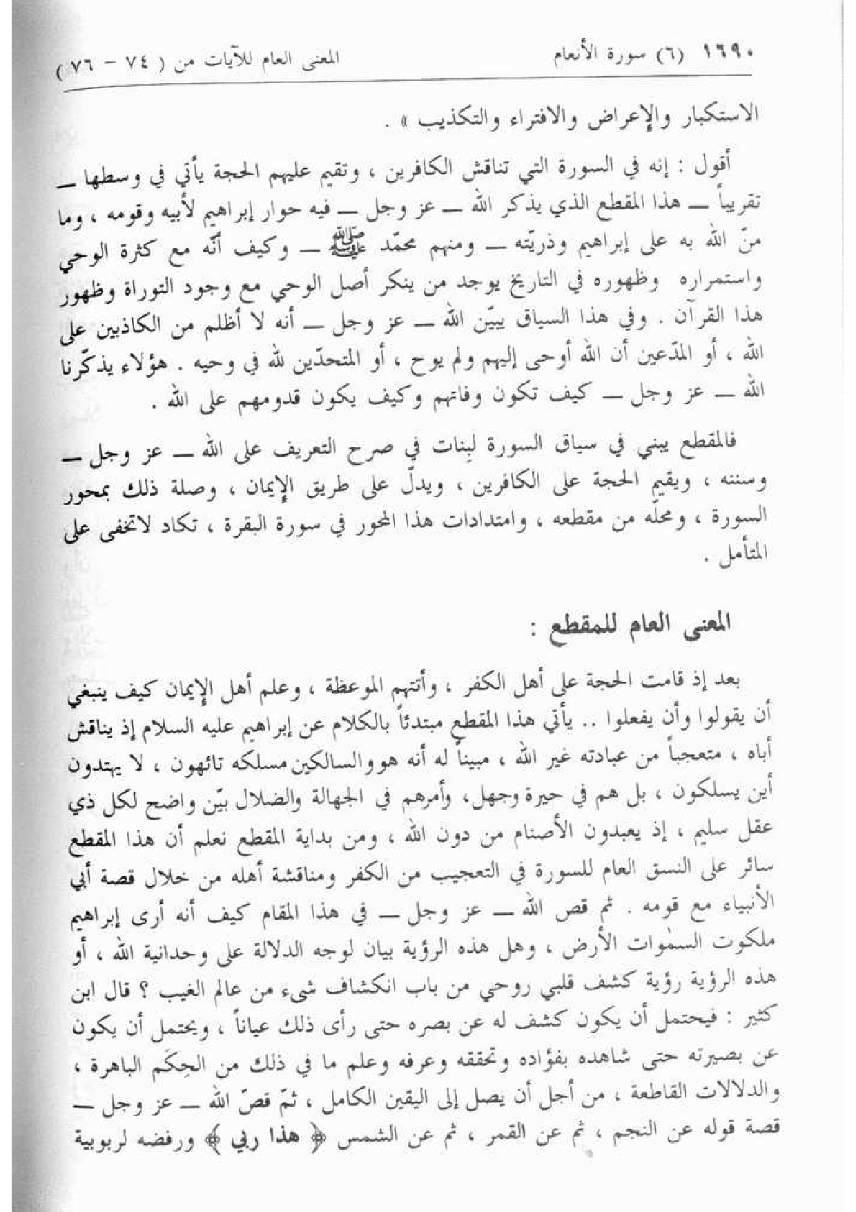 بعد إذ قامت الحجة على أهل الكفر، وأتتهم الموعظة، وعلم أهل الإيمان كيف ينبغي أن يقولوا وأن يفعلوا .. يأتي هذا المقطع مبتدئا بالكلام عن إبراهيم عليه السلام إذ يناقش أباه، متعجبا من عبادته غير الله، مبينا له أنه هو والسالكين مسلكه تائهون، لا يهتدون أين يسلكون، بل هم في حيرة وجهل، وأمرهم في الجهالة والضلال بيّن واضح لكل ذي عقل سليم، إذ يعبدون الأصنام من دون الله، ومن بداية المقطع نعلم أن هذا المقطع سائر على النسق العام للسورة في التعجيب من الكفر ومناقشة أهله من خلال قصة أبي الأنبياء مع قومه. ثم قص الله- عزّ وجل- في هذا المقام كيف أنه أرى إبراهيم ملكوت السموات والأرض، وهل هذه الرؤية بيان لوجه الدلالة على وحدانية الله، أو هذه الرؤية رؤية كشف قلبي روحي من باب انكشاف شئ من عالم الغيب؟ قال ابن كثير: فيحتمل أن يكون كشف له عن بصره حتى رأى ذلك عيانا، ويحتمل أن يكون عن بصيرته حتى شاهده بفؤاده وتحققه وعرفه وعلم ما في ذلك من الحكم الباهرة، والدلالات القاطعة، من أجل أن يصل إلى اليقين الكامل، ثمّ قصّ الله- عزّ وجل- قصة قوله عن النجم، ثم عن القمر، ثم عن الشمس هذا رَبِّي ورفضه لربوبية