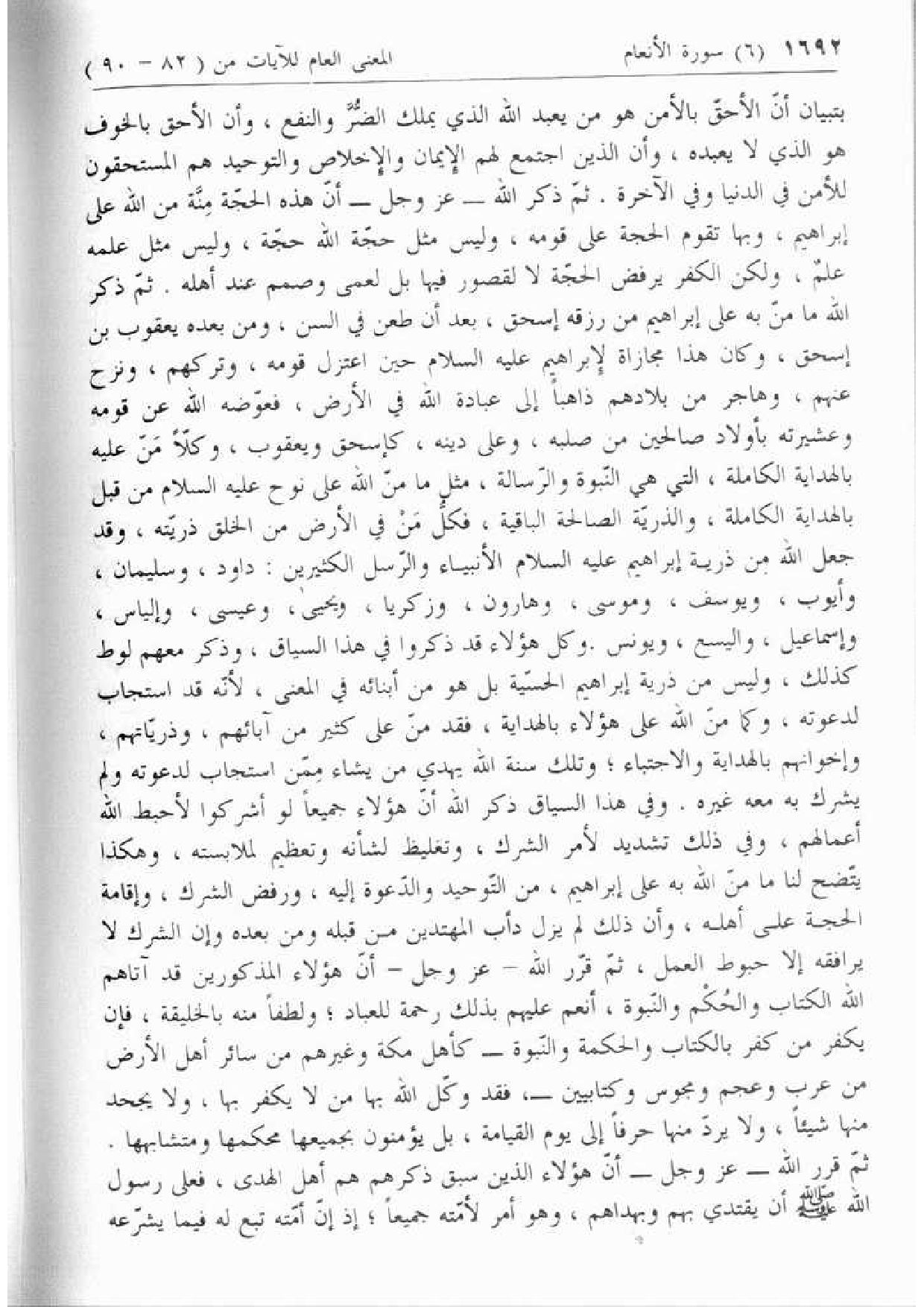 بتبيان أنّ الأحقّ بالأمن هو من يعبد الله الذي يملك الضّرّ والنفع، وأن الأحق بالخوف هو الذي لا يعبده، وأن الذين اجتمع لهم الإيمان والإخلاص والتوحيد هم المستحقون للأمن في الدنيا وفي الآخرة. ثمّ ذكر الله- عزّ وجل- أنّ هذه الحجّة منّة من الله على إبراهيم، وبها تقوم الحجة على قومه، وليس مثل حجّة الله حجّة، وليس مثل علمه علم، ولكن الكفر يرفض الحجّة لا لقصور فيها بل لعمى وصمم عند أهله. ثمّ ذكر الله ما منّ به على إبراهيم من رزقه إسحاق، بعد أن طعن في السن، ومن بعده يعقوب بن إسحاق، وكان هذا مجازاة لإبراهيم عليه السلام حين اعتزل قومه، وتركهم، ونزح عنهم، وهاجر من بلادهم ذاهبا إلى عبادة الله في الأرض، فعوّضه الله عن قومه وعشيرته بأولاد صالحين من صلبه، وعلى دينه، كإسحاق ويعقوب، وكلّا منّ عليه بالهداية الكاملة، التي هي النّبوة والرّسالة، مثل ما منّ الله على نوح عليه السلام من قبل بالهداية الكاملة، والذريّة الصالحة الباقية، فكلّ من في الأرض من الخلق ذريّته، وقد جعل الله من ذرية إبراهيم عليه السلام الأنبياء والرّسل الكثيرين: داود، وسليمان، وأيوب، ويوسف، وموسى، وهارون، وزكريا، ويحيى، وعيسى، وإلياس، وإسماعيل، واليسع، ويونس. وكل هؤلاء قد ذكروا في هذا السياق، وذكر معهم لوط كذلك، وليس من ذرية إبراهيم الحسّية بل هو من أبنائه في المعنى، لأنّه قد استجاب لدعوته، وكما منّ الله على هؤلاء بالهداية، فقد منّ على كثير من آبائهم،