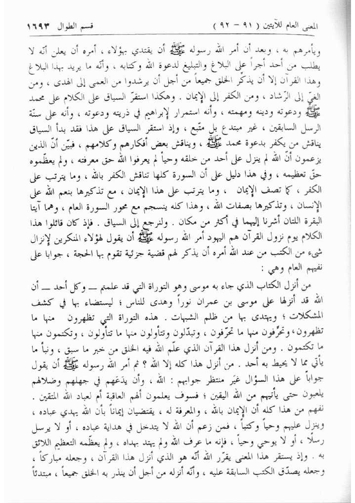 نفهم من هذا كله أن الإيمان بالله، والمعرفة له، يقتضيان إيمانا بأن الله يهدي عباده، وينزل عليهم وحيا وكتبا، فمن زعم أن الله لا يتدخل في هداية عباده، أو لا يرسل رسلا، أو لا يوحي وحيا، فإنه ما عرف الله ولم يهتد بهداه، ولم يعظّمه التعظيم اللائق به. وإذ يستقر هذا المعنى يقرّر الله أنّه هو الذي أنزل هذا القرآن، وجعله مباركا، وجعله يصدّق الكتب السابقة عليه، وأنّه أنزله من أجل أن ينذر به الخلق جميعا، مبتدئا