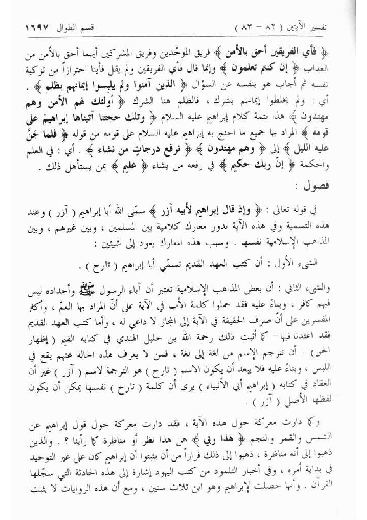 وكما دارت معركة حول هذه الآية، فقد دارت معركة حول قول إبراهيم عن الشمس والقمر والنجم هذا رَبِّي هل هذا نظر أو مناظرة كما رأينا؟. والذين ذهبوا إلى أنه مناظرة، ذهبوا إلى ذلك فرارا من أن يثبتوا أن إبراهيم كان على غير التوحيد في بداية أمره، وفي أخبار التلمود من كتب اليهود إشارة إلى هذه الحادثة التي سجّلها القرآن. وأنها حصلت لإبراهيم وهو ابن ثلاث سنين، ومع أن هذه الروايات لا يثبت