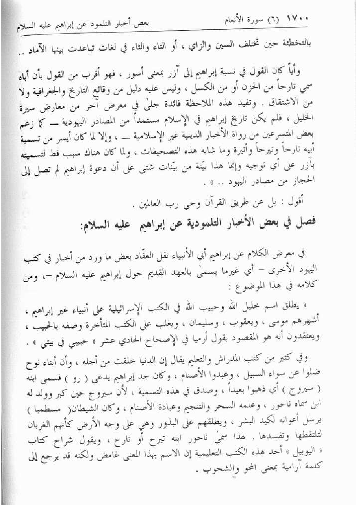 وأيا كان القول في نسبة إبراهيم إلى آزر بمعنى أسور، فهو أقرب من القول بأن أباه سمي تارحا من الحزن أو من الكسل، وليس عليه دليل من وقائع التاريخ والجغرافية ولا من الاشتقاق. وتفيد هذه الملاحظة فائدة جلى في معرض آخر من معارض سيرة الخليل، فلم يكن تاريخ إبراهيم في الإسلام مستمدا من المصادر اليهودية- كما زعم بعض المتسرعين من رواة الأخبار الدينية غير الإسلامية-، وإلا لما كان أيسر من تسمية أبيه تارحا وتيرحا وأتيرة وما شابه هذه التصحيفات، ولما كان هناك سبب قط لتسميته بآزر على أي توجيه وإنما هذا بيّنة من بيّنات شتى على أن دعوة إبراهيم لم تصل إلى الحجاز من مصادر اليهود .. ».