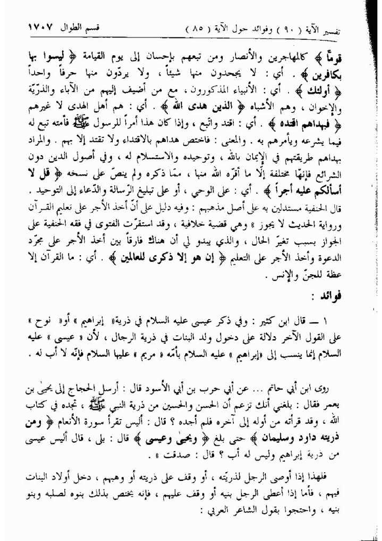 1 - قال ابن كثير: وفي ذكر عيسى عليه السلام في ذرية «إبراهيم» أو «نوح» على القول الآخر دلالة على دخول ولد البنات في ذرية الرجال، لأن «عيسى» عليه السلام إنما ينسب إلى «إبراهيم» عليه السلام بأمّه «مريم» عليها السلام فإنّه لا أب له.