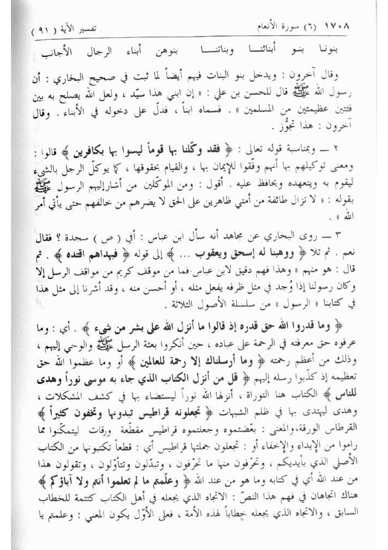 الكتاب هنا التوراة، أنزلها الله نورا ليستضاء بها في كشف المشكلات، وهدى ليهتدى بها في ظلم الشبهات تَجْعَلُونَهُ قَراطِيسَ تُبْدُونَها وَتُخْفُونَ كَثِيراً القرطاس الورقة، والمعنى: بعّضتموه وجعلتموه قراطيس مقطّعة ورقات ليتمكّنوا مما راموا من الإبداء والإخفاء أو: تجعلون جملتها قراطيس أي: قطعا تكتبونها من الكتاب الأصلي الذي بأيديكم، وتحرّفون منها ما تحرّفون، وتبدّلون وتتأوّلون، وتقولون هذا من عند الله أي في كتابه وما هو من عند الله وَعُلِّمْتُمْ ما لَمْ تَعْلَمُوا أَنْتُمْ وَلا آباؤُكُمْ هناك اتجاهان في فهم هذا النصّ: الاتجاه الذي يجعله في أهل الكتاب كتتمة للخطاب السابق، والاتجاه الذي يجعله خطابا لهذه الأمة، فعلى الأوّل يكون المعني: وعلمتم يا