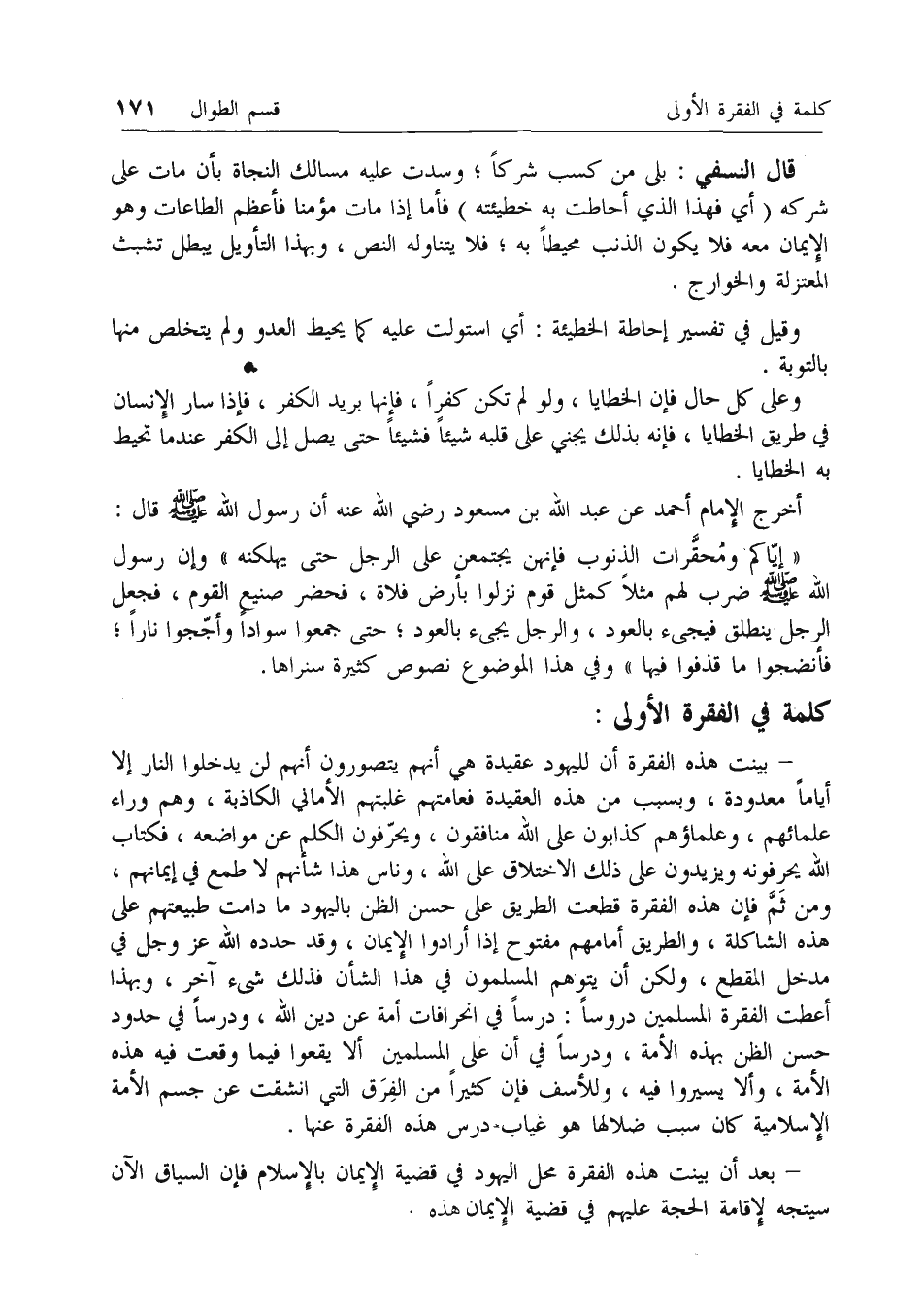 قال النسفي: بلى من كسب شركا؛ وسدت عليه مسالك النجاة بأن مات على شركه (أي فهذا الذي أحاطت به خطيئته) فأما إذا مات مؤمنا فأعظم الطاعات وهو الإيمان معه فلا يكون الذنب محيطا به؛ فلا يتناوله النص، وبهذا التأويل يبطل تشبث المعتزلة والخوارج.