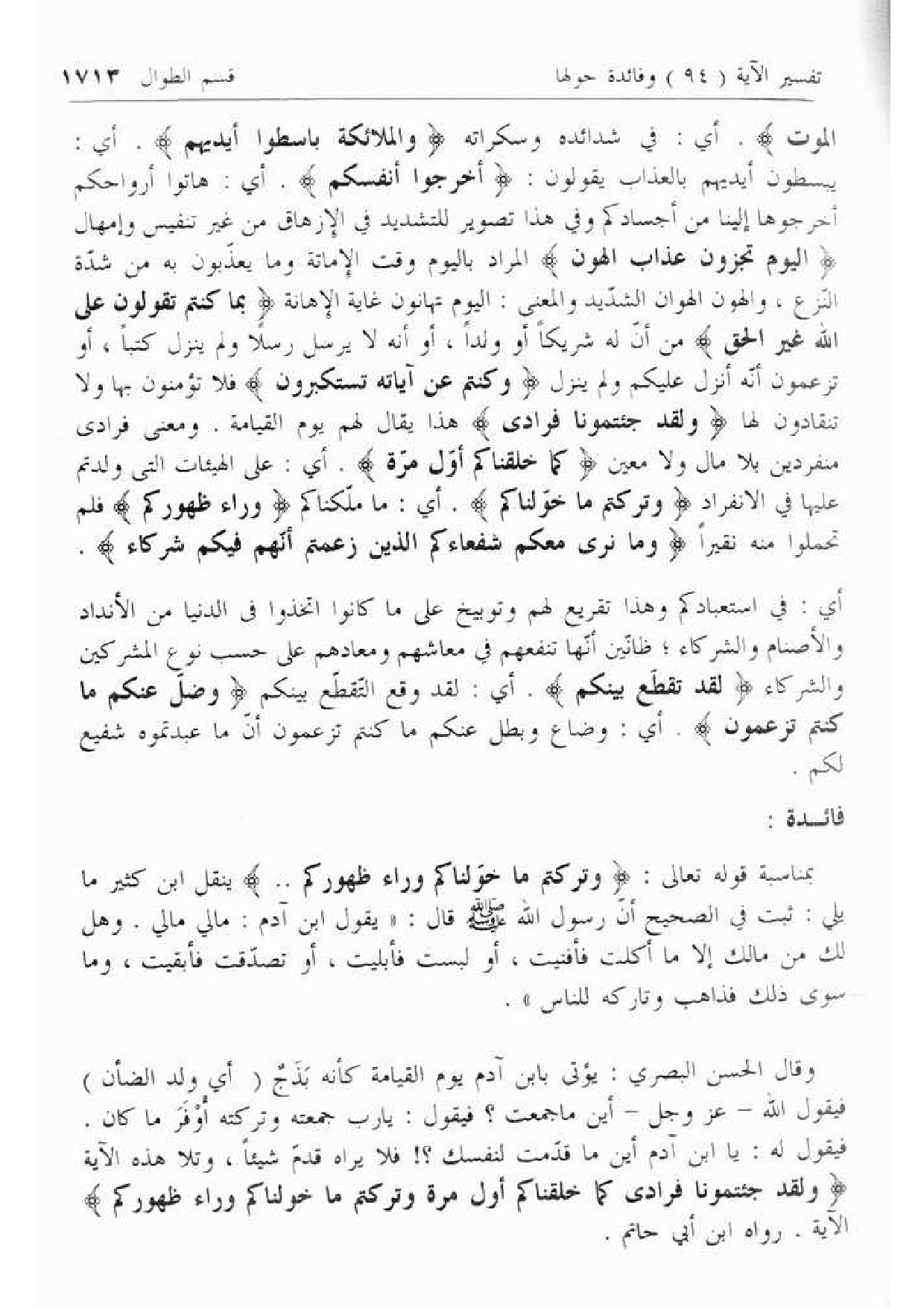 بمناسبة قوله تعالى: وَتَرَكْتُمْ ما خَوَّلْناكُمْ وَراءَ ظُهُورِكُمْ .. ينقل ابن كثير ما يلي: ثبت في الصحيح أنّ رسول الله صلّى الله عليه وسلّم قال: «يقول ابن آدم: مالي مالي. وهل لك من مالك إلا ما أكلت فأفنيت، أو لبست فأبليت، أو تصدّقت فأبقيت، وما سوى ذلك فذاهب وتاركه للناس».
