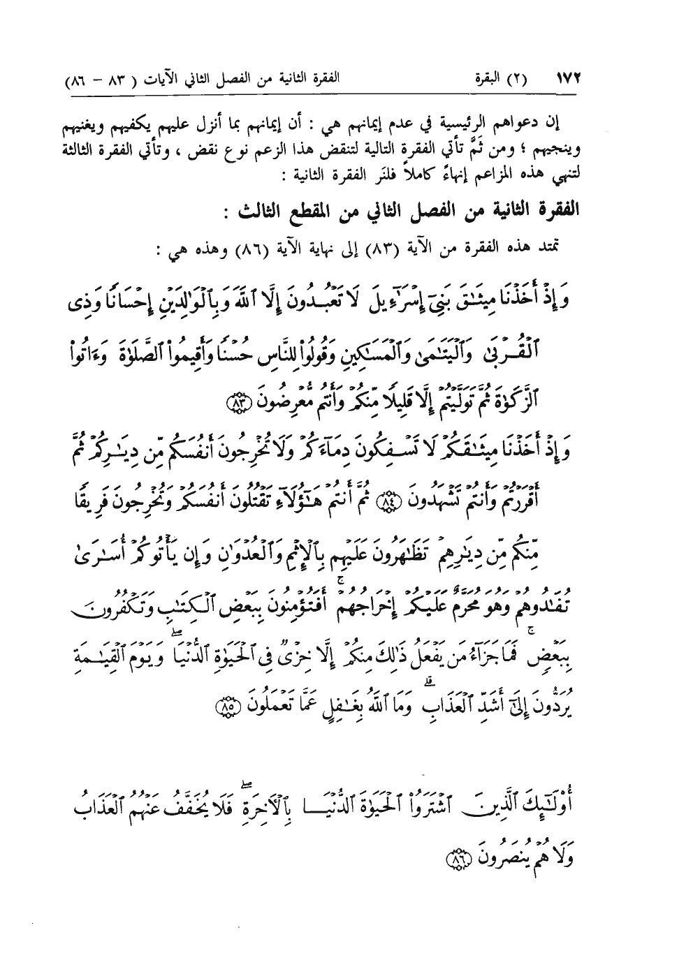 وَإِذْ أَخَذْنا مِيثاقَ بَنِي إِسْرائِيلَ لا تَعْبُدُونَ إِلاَّ اللَّهَ وَبِالْوالِدَيْنِ إِحْساناً وَذِي الْقُرْبى وَالْيَتامى وَالْمَساكِينِ وَقُولُوا لِلنَّاسِ حُسْناً وَأَقِيمُوا الصَّلاةَ وَآتُوا الزَّكاةَ ثُمَّ تَوَلَّيْتُمْ إِلاَّ قَلِيلاً مِنْكُمْ وَأَنْتُمْ مُعْرِضُونَ (83) وَإِذْ أَخَذْنا مِيثاقَكُمْ لا تَسْفِكُونَ دِماءَكُمْ وَلا تُخْرِجُونَ أَنْفُسَكُمْ مِنْ دِيارِكُمْ ثُمَّ أَقْرَرْتُمْ وَأَنْتُمْ تَشْهَدُونَ (84) ثُمَّ أَنْتُمْ هؤُلاءِ تَقْتُلُونَ أَنْفُسَكُمْ وَتُخْرِجُونَ فَرِيقاً مِنْكُمْ مِنْ دِيارِهِمْ تَظاهَرُونَ عَلَيْهِمْ بِالْإِثْمِ وَالْعُدْوانِ وَإِنْ يَأْتُوكُمْ أُسارى تُفادُوهُمْ وَهُوَ مُحَرَّمٌ عَلَيْكُمْ إِخْراجُهُمْ أَفَتُؤْمِنُونَ بِبَعْضِ الْكِتابِ وَتَكْفُرُونَ بِبَعْضٍ فَما جَزاءُ مَنْ يَفْعَلُ ذلِكَ مِنْكُمْ إِلاَّ خِزْيٌ فِي الْحَياةِ الدُّنْيا وَيَوْمَ الْقِيامَةِ يُرَدُّونَ إِلى أَشَدِّ الْعَذابِ وَمَا اللَّهُ بِغافِلٍ عَمَّا تَعْمَلُونَ (85) أُولئِكَ الَّذِينَ اشْتَرَوُا الْحَياةَ الدُّنْيا بِالْآخِرَةِ فَلا يُخَفَّفُ عَنْهُمُ الْعَذابُ وَلا هُمْ يُنْصَرُونَ (86)