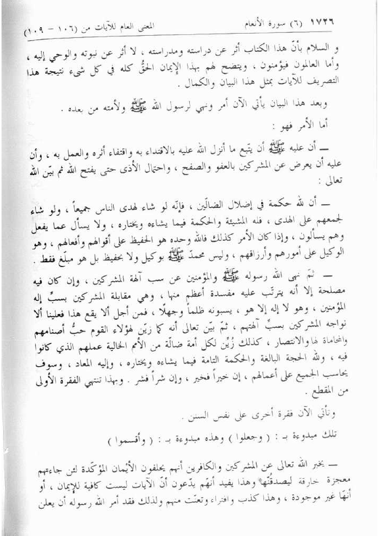 - ثمّ نهى الله رسوله صلّى الله عليه وسلّم والمؤمنين عن سب آلهة المشركين، وإن كان فيه مصلحة إلا أنه يترتّب عليه مفسدة أعظم منها، وهي مقابلة المشركين بسبّ إله المؤمنين، وهو لا إله إلا هو، يسبونه ظلما وجهلا، فمن أجل ألا يقع هذا فعلينا ألا نواجه المشركين بسبّ آلهتهم، ثمّ بيّن تعالى أنه كما زيّن لهؤلاء القوم حبّ أصنامهم والمحاماة لها والانتصار، كذلك زيّن لكل أمة ضالّة من الأمم الخالية عملهم الذي كانوا فيه، ولله الحجة البالغة والحكمة التامة فيما يشاؤه ويختاره، وإليه المعاد، وسوف يحاسب الجميع على أعمالهم، إن خيرا فخير، وإن شرا فشر. وبهذا تنتهي الفقرة الأولى من المقطع.