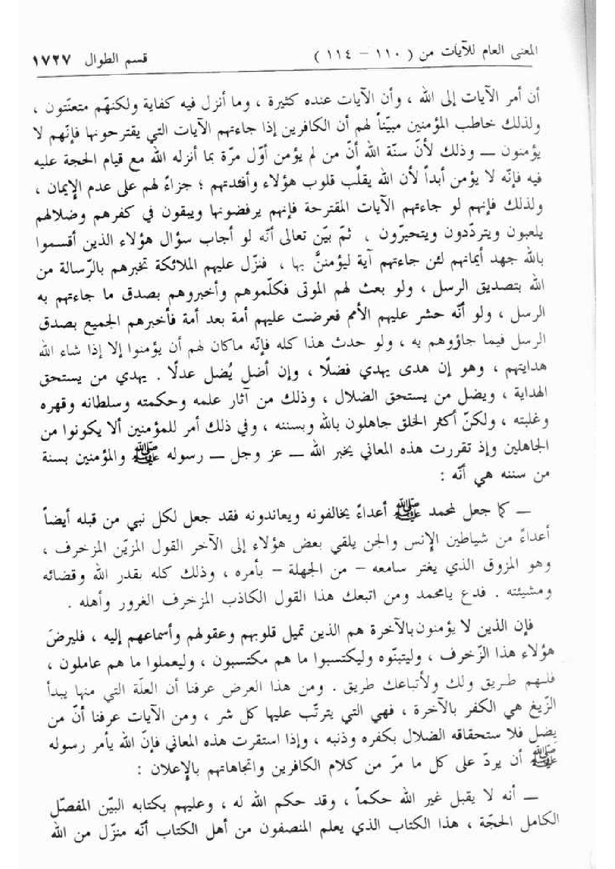 عدم الإيمان، ولذلك فإنهم لو جاءتهم الآيات المقترحة فإنهم يرفضونها ويبقون في كفرهم وضلالهم يلعبون ويتردّدون ويتحيّرون، ثمّ بيّن تعالى أنّه لو أجاب سؤال هؤلاء الذين أقسموا بالله جهد أيمانهم لئن جاءتهم آية ليؤمننّ بها، فنزّل عليهم الملائكة تخبرهم بالرّسالة من الله بتصديق الرسل، ولو بعث لهم الموتى فكلّموهم وأخبروهم بصدق ما جاءتهم به الرسل، ولو أنّه حشر عليهم الأمم فعرضت عليهم أمة بعد أمة فأخبرهم الجميع بصدق الرسل فيما جاءوهم به، ولو حدث هذا كله فإنّه ما كان لهم أن يؤمنوا إلا إذا شاء الله هدايتهم، وهو إن هدى يهدي فضلا، وإن أضل يضل عدلا. يهدي من يستحق الهداية، ويضل من يستحق الضلال، وذلك من آثار علمه وحكمته وسلطانه وقهره وغلبته، ولكنّ أكثر الخلق جاهلون بالله وبسننه، وفي ذلك أمر للمؤمنين ألا يكونوا من الجاهلين وإذ تقررت هذه المعاني يخبر الله- عزّ وجل- رسوله صلّى الله عليه وسلّم والمؤمنين بسنة من سننه هي أنّه: