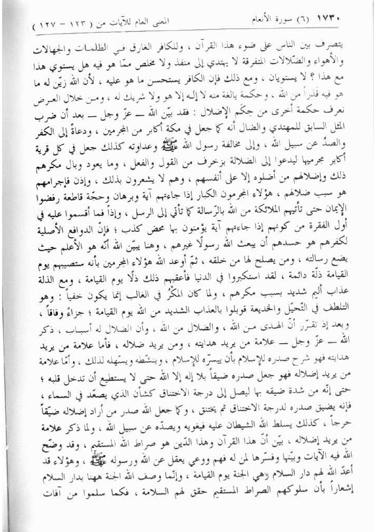 يتصرف بين الناس على ضوء هذا القرآن، وللكافر الغارق في الظلمات والجهالات والأهواء والضّلالات المتفرقة لا يهتدي إلى منفذ ولا مخلص ممّا هو فيه هل يستوي هذا مع هذا؟ لا يستويان، ومع ذلك فإن الكافر يستحسن ما هو عليه، لأن الله زيّن له ما هو فيه قدرا من الله، وحكمة بالغة منه لا إله إلا هو ولا شريك له، ومن خلال العرض نعرف حكمة أخرى من حكم الإضلال: فقد بيّن الله- عزّ وجل- بعد أن ضرب المثل السابق للمهتدي والضال أنه كما جعل في مكة أكابر من المجرمين، ودعاة إلى الكفر والصدّ عن سبيل الله، وإلى مخالفة رسول الله صلّى الله عليه وسلّم وعداوته كذلك جعل في كل قرية أكابر مجرميها ليدعوا إلى الضلالة بزخرف من القول والفعل، وما يعود وبال مكرهم ذلك وإضلالهم من أضلوه إلا على أنفسهم، وهم لا يشعرون بذلك، وإذن فإجرامهم هو سبب ضلالهم، هؤلاء المجرمون الكبار إذا جاءتهم آية وبرهان وحجّة قاطعة رفضوا الإيمان حتى تأتيهم الملائكة من الله بالرّسالة كما تأتي إلى الرسل، وإذا فما أقسموا عليه في أول الفقرة من كونهم إذا جاءتهم آية يؤمنون بها محض كذب؛ فإنّ الدوافع الأصلية لكفرهم هو حسدهم أن يبعث الله رسولا غيرهم، وهنا يبيّن الله أنّه هو الأعلم حيث يضع رسالته، ومن يصلح لها من خلقه، ثمّ أوعد الله هؤلاء المجرمين بأنه ستصيبهم يوم القيامة ذلّة دائمة، لقد استكبروا في الدنيا فأعقبهم ذلك ذلا يوم القيامة، ومع الذلة عذاب أليم شديد بسبب مكرهم، ولما كان المكر في الغالب إنما يكون خفيا: وهو التلطف في التّحيّل والخديعة قوبلوا بالعذاب الشديد من الله يوم القيامة؛ جزاء وفاقا، وبعد إذ تقرّر أنّ الهدى من الله، والضلال من الله، وأن الضلال له أسباب، ذكر الله- عزّ وجل- علامة من يريد هدايته، ومن يريد ضلاله، فأما علامة من يريد هدايته فهو شرح صدره للإسلام بأن ييسّره للإسلام، وينشّطه ويسهّله لذلك، وأمّا علامة من يريد إضلاله فهو جعل صدره ضيقا بلا إله إلا الله حتى لا يستطيع أن تدخل قلبه؛ حتى إنّه من شدة ضيقه بها ليصل إلى درجة الاختناق كشأن الذي يصعّد في السماء، فإنه يضيق صدره لدرجة الاختناق ثم يختنق، وكما جعل الله صدر من أراد إضلاله ضيّقا حرجا، كذلك يسلط الله الشيطان عليه فيغويه ويصدّه عن سبيل الله، ولما ذكر علامة من يريد إضلاله، بيّن أنّ هذا القرآن وهذا الدّين هو صراط الله المستقيم، وقد وضّح الله فيه الآيات وبيّنها وفسّرها لمن له فهم ووعي يعقل عن الله ورسوله صلّى الله عليه وسلّم، وهؤلاء قد أعدّ الله لهم دار السلام وهي الجنة يوم القيامة، وإنّما وصف الله الجنة هاهنا بدار السلام إشعارا بأن سلوكهم الصراط المستقيم حقق لهم السلامة، فكما سلموا من آفات