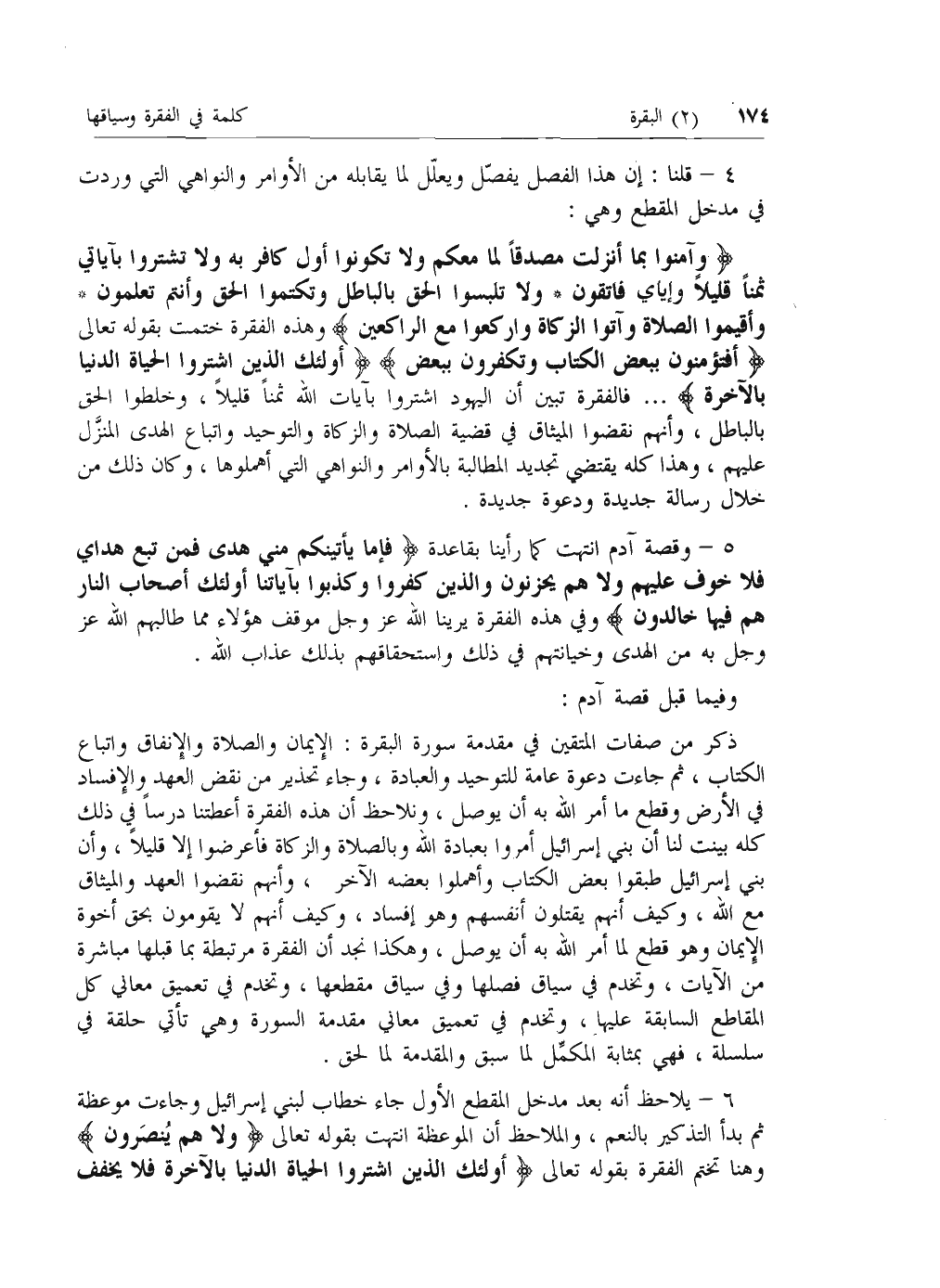 وَآمِنُوا بِما أَنْزَلْتُ مُصَدِّقاً لِما مَعَكُمْ وَلا تَكُونُوا أَوَّلَ كافِرٍ بِهِ وَلا تَشْتَرُوا بِآياتِي ثَمَناً قَلِيلًا وَإِيَّايَ فَاتَّقُونِ* وَلا تَلْبِسُوا الْحَقَّ بِالْباطِلِ وَتَكْتُمُوا الْحَقَّ وَأَنْتُمْ تَعْلَمُونَ* وَأَقِيمُوا الصَّلاةَ وَآتُوا الزَّكاةَ وَارْكَعُوا مَعَ الرَّاكِعِينَ وهذه الفقرة ختمت بقوله تعالى أَفَتُؤْمِنُونَ بِبَعْضِ الْكِتابِ وَتَكْفُرُونَ بِبَعْضٍ أُولئِكَ الَّذِينَ اشْتَرَوُا الْحَياةَ الدُّنْيا بِالْآخِرَةِ ... فالفقرة تبين أن اليهود اشتروا بآيات الله ثمنا قليلا، وخلطوا الحق بالباطل، وأنهم نقضوا الميثاق في قضية الصلاة والزكاة والتوحيد واتباع الهدى المنزل عليهم، وهذا كله يقتضي تجديد المطالبة بالأوامر والنواهي التي أهملوها، وكان ذلك من خلال رسالة جديدة ودعوة جديدة.