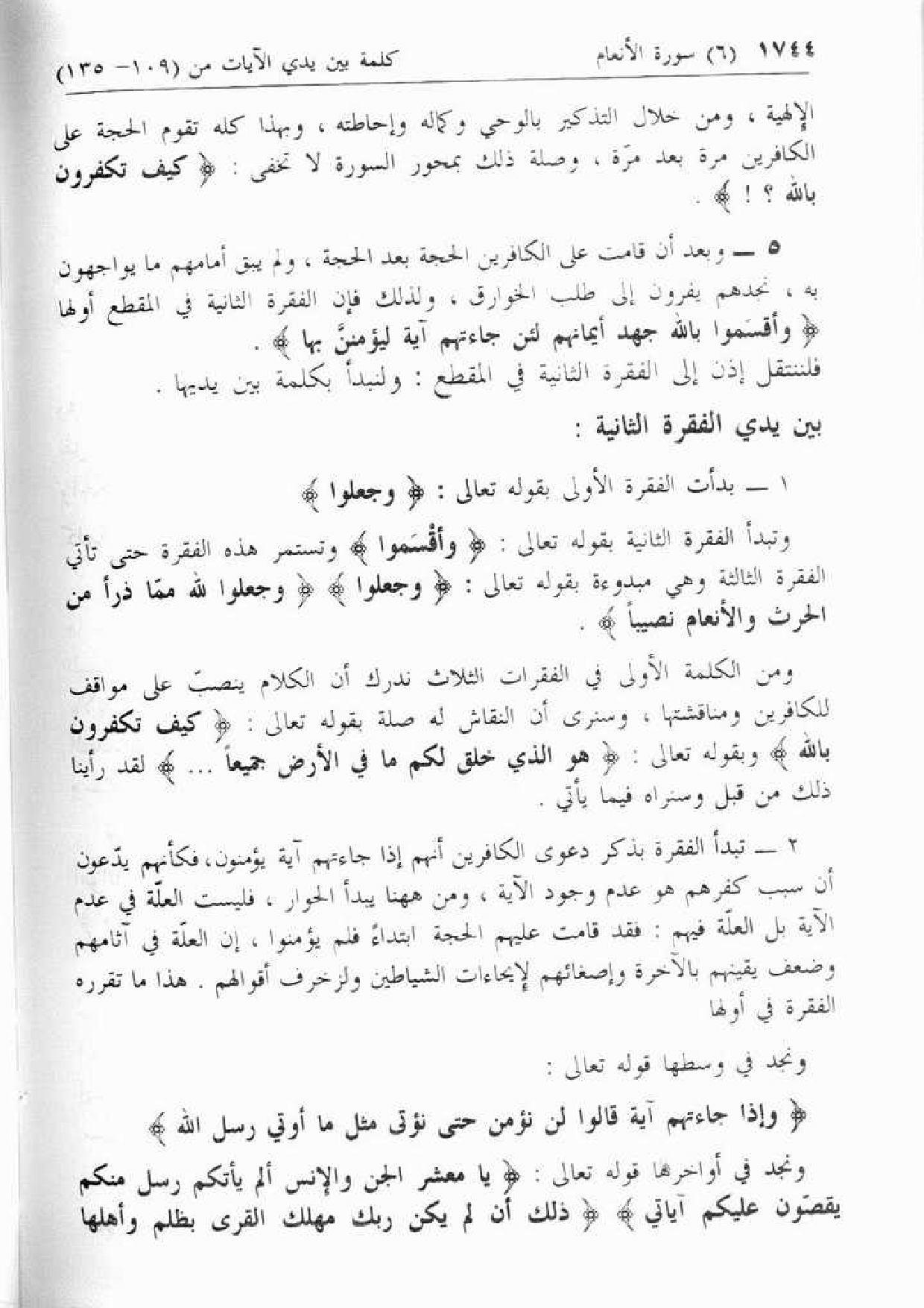 2 - تبدأ الفقرة بذكر دعوى الكافرين أنهم إذا جاءتهم آية يؤمنون، فكأنهم يدّعون أن سبب كفرهم هو عدم وجود الآية، ومن هاهنا يبدأ الحوار، فليست العلّة في عدم الآية بل العلّة فيهم: فقد قامت عليهم الحجة ابتداء فلم يؤمنوا، إن العلّة في آثامهم وضعف يقينهم بالآخرة وإصغائهم لإيحاءات الشياطين ولزخرف أقوالهم. هذا ما تقرره الفقرة في أولها