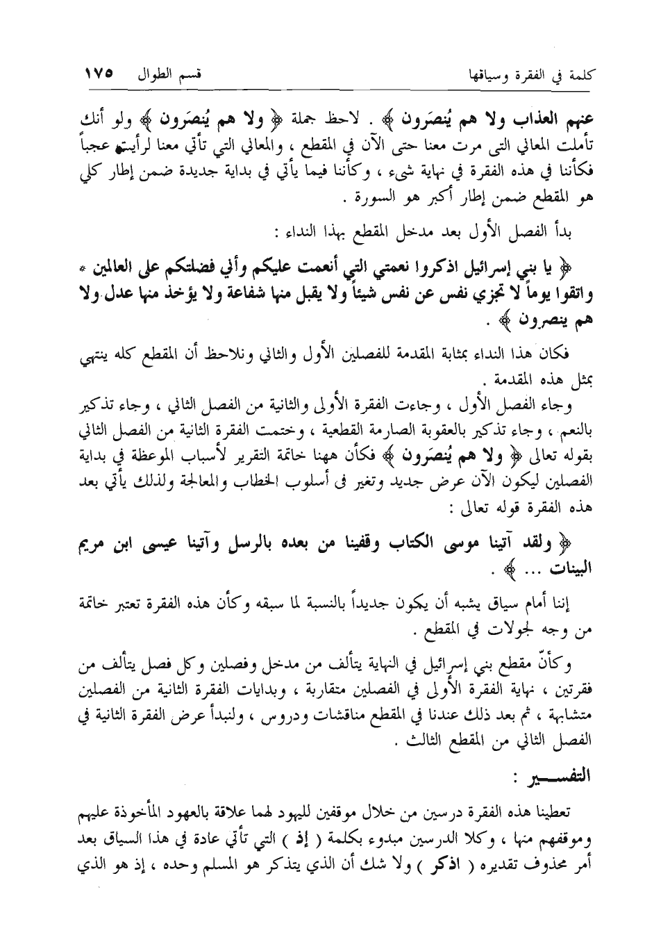 وجاء الفصل الأول، وجاءت الفقرة الأولى والثانية من الفصل الثاني، وجاء تذكير بالنعم، وجاء تذكير بالعقوبة الصارمة القطعية، وختمت الفقرة الثانية من الفصل الثاني بقوله تعالى وَلا هُمْ يُنْصَرُونَ فكأن هاهنا خاتمة التقرير لأسباب الموعظة في بداية الفصلين ليكون الآن عرض جديد وتغير فى أسلوب الخطاب والمعالجة ولذلك يأتي بعد هذه الفقرة قوله تعالى: