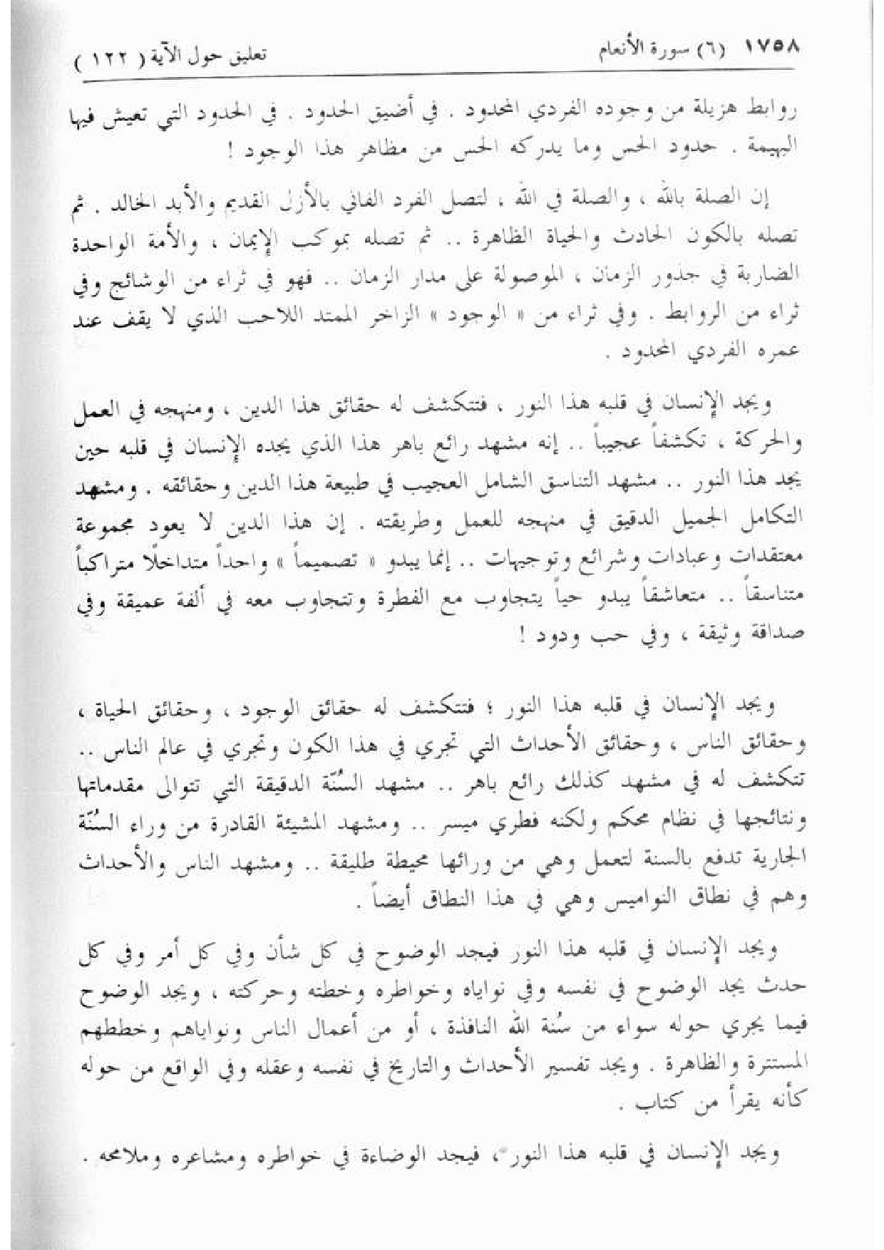 إن الصلة بالله، والصلة في الله، لتصل الفرد الفاني بالأزل القديم والأبد الخالد. ثم تصله بالكون الحادث والحياة الظاهرة .. ثم تصله بموكب الإيمان، والأمة الواحدة الضاربة في جذور الزمان، الموصولة على مدار الزمان .. فهو في ثراء من الوشائج وفي ثراء من الروابط. وفي ثراء من «الوجود» الزاخر الممتد اللاحب الذي لا يقف عند عمره الفردي المحدود.
