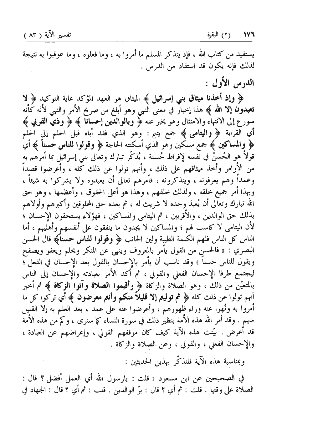 وَإِذْ أَخَذْنا مِيثاقَ بَنِي إِسْرائِيلَ الميثاق هو العهد المؤكد غاية التوكيد لا تَعْبُدُونَ إِلَّا اللَّهَ هذا إخبار في معنى النهي وهو أبلغ من صريح الأمر والنهي لأنه كأنه سورع إلى الانتهاء والامتثال وهو يخبر عنه وَبِالْوالِدَيْنِ إِحْساناً وَذِي الْقُرْبى أي القرابة وَالْيَتامى جمع يتيم: وهو الذي فقد أباه قبل الحلم إلى الحلم وَالْمَساكِينِ جمع مسكين وهو الذي أسكنته الحاجة وَقُولُوا لِلنَّاسِ حُسْناً أي قولا هو الحسن في نفسه لإفراط حسنة، يذكر تبارك وتعالى بني إسرائيل بما أمرهم به من الأوامر وأخذ ميثاقهم على ذلك، وأنهم تولوا عن ذلك كله، وأعرضوا قصدا وعمدا وهم يعرفونه، ويتذكرونه، فأمرهم تعالى أن يعبدوه ولا يشركوا به شيئا، وبهذا أمر جميع خلقه، ولذلك خلقهم، وهذا هو أعلى الحقوق، وأعظمها، وهو حق الله تبارك وتعالى أن يعبد وحده لا شريك له، ثم بعده حق المخلوقين وأكبرهم وأولادهم بذلك حق الوالدين، والأقربين، ثم اليتامى والمساكين، فهؤلاء يستحقون الإحسان؛ لأن اليتامى لا كاسب لهم؛ والمساكين لا يجدون ما ينفقون على أنفسهم وأهليهم، أما الناس كل الناس فلهم الكلمة الطيبة ولين الجانب وَقُولُوا لِلنَّاسِ حُسْناً قال الحسن البصري: «فالحسن من القول يأمر بالمعروف وينهى عن المنكر ويحلم ويعفو ويصفح ويقول للناس حسنا» وقد ناسب أن يأمر بالإحسان بالقول بعد الإحسان في الفعل؛ ليجتمع طرفا الإحسان الفعلي والقولي، ثم أكد الأمر بعبادته والإحسان إلى الناس بالمتعين من ذلك، وهو الصلاة والزكاة وَأَقِيمُوا الصَّلاةَ وَآتُوا الزَّكاةَ ثم أخبر أنهم تولوا عن ذلك كله ثُمَّ تَوَلَّيْتُمْ إِلَّا قَلِيلًا مِنْكُمْ وَأَنْتُمْ مُعْرِضُونَ أي تركوا كل ما أمروا به ونهوا عنه وراء ظهورهم، وأعرضوا عنه على عمد، بعد العلم به إلا القليل منهم. وقد أمر الله هذه الأمة بنظير ذلك في سورة النساء كما سنرى، وكم من هذه الأمة قد أعرض. بينت هذه الآية كيف كان موقفهم القولي، وإعراضهم عن العبادة، والإحسان الفعلي، والقولي، وعن الصلاة والزكاة.