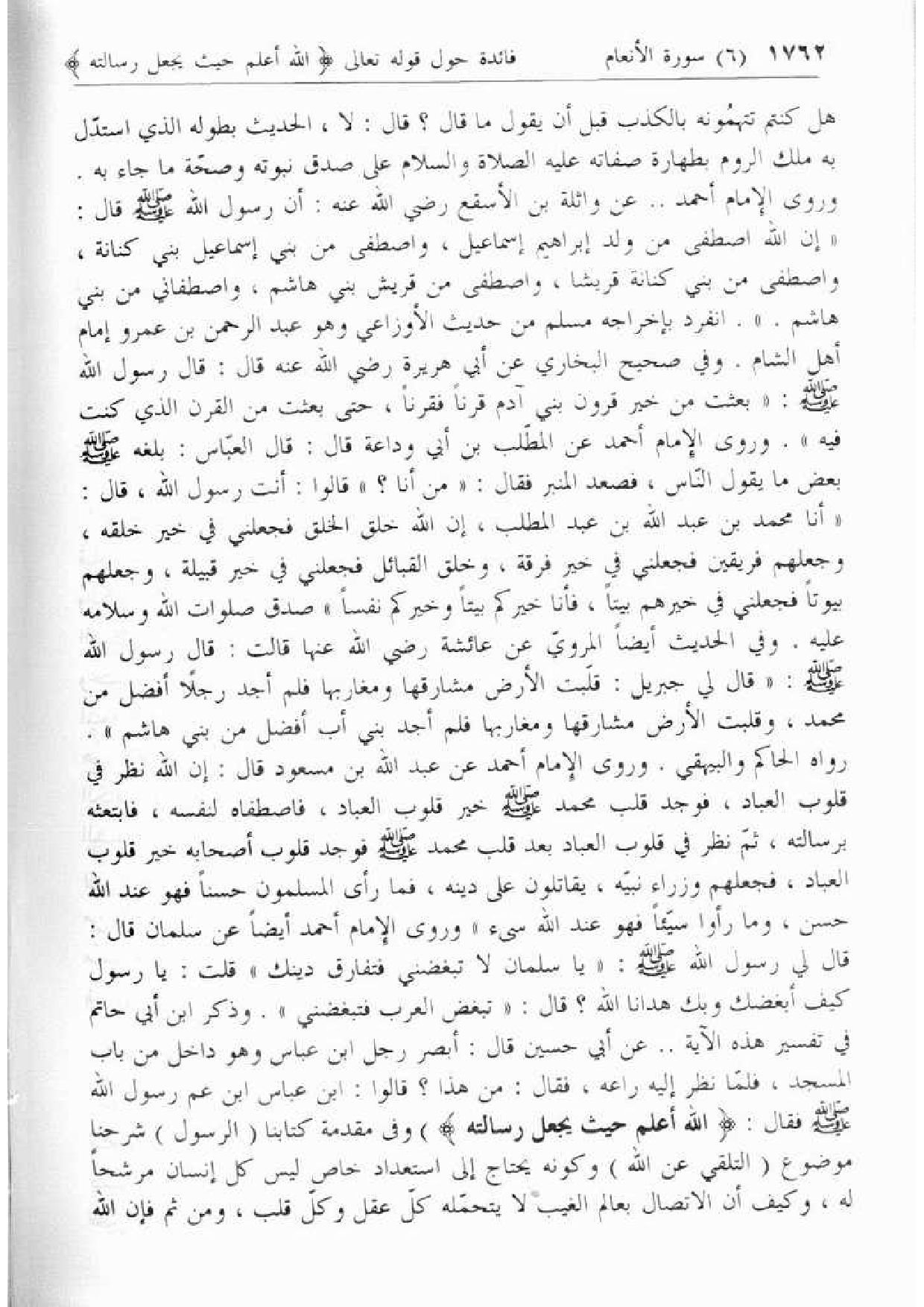 قال لي رسول الله صلّى الله عليه وسلّم: «يا سلمان لا تبغضني فتفارق دينك» قلت: يا رسول كيف أبغضك وبك هدانا الله؟ قال: «تبغض العرب فتبغضني». وذكر ابن أبي حاتم في تفسير هذه الآية .. عن أبي حسين قال: أبصر رجل ابن عباس وهو داخل من باب المسجد، فلمّا نظر إليه راعه، فقال: من هذا؟ قالوا: ابن عباس ابن عم رسول الله صلّى الله عليه وسلّم فقال: اللَّهُ أَعْلَمُ حَيْثُ يَجْعَلُ رِسالَتَهُ) وفي مقدمة كتابنا (الرسول) شرحنا موضوع (التلقي عن الله) وكونه يحتاج إلى استعداد خاص ليس كل إنسان مرشحا له، وكيف أن الاتصال بعالم الغيب لا يتحمّله كلّ عقل وكلّ قلب، ومن ثم فإن الله