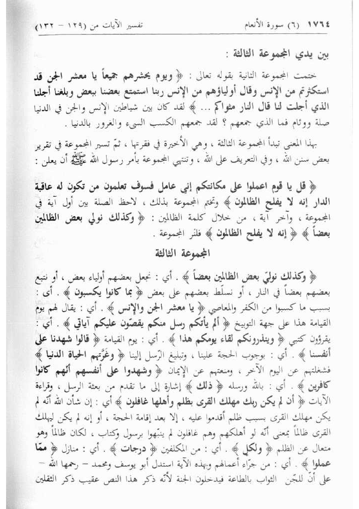 قُلْ يا قَوْمِ اعْمَلُوا عَلى مَكانَتِكُمْ إِنِّي عامِلٌ فَسَوْفَ تَعْلَمُونَ مَنْ تَكُونُ لَهُ عاقِبَةُ الدَّارِ إِنَّهُ لا يُفْلِحُ الظَّالِمُونَ وتختم المجموعة بذلك، لاحظ الصلة بين أول آية في المجموعة، وآخر آية، من خلال كلمة الظالمين: وَكَذلِكَ نُوَلِّي بَعْضَ الظَّالِمِينَ بَعْضاً إِنَّهُ لا يُفْلِحُ الظَّالِمُونَ فلنر المجموعة.