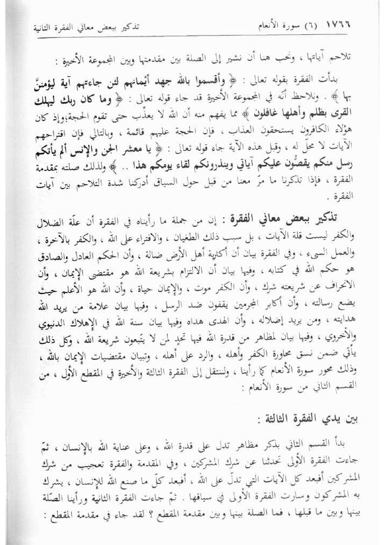 تذكير ببعض معاني الفقرة: إن من جملة ما رأيناه في الفقرة أن علّة الضلال والكفر ليست قلة الآيات، بل سبب ذلك الطغيان، والافتراء على الله، والكفر بالآخرة، والعمل السيئ، وفي الفقرة بيان أن أكثرية أهل الأرض ضالة، وأن الحكم العادل والصادق هو حكم الله في كتابه، وفيها بيان أن الالتزام بشريعة الله هو مقتضى الإيمان، وأن الانحراف عن شريعته شرك، وأن الكفر موت، والإيمان حياة، وأن الله هو الأعلم حيث يضع رسالته، وأن أكابر المجرمين يقفون ضد الرسل، وفيها بيان علامة من يريد الله هدايته، ومن يريد إضلاله، وأن الهدى هداه وفيها بيان سنة الله في الإهلاك الدنيوي والأخروي، وفيها بيان لمظاهر من قدرة الله فيها تحد لمن لا يتّبعون شريعة الله، وكل ذلك يأتي ضمن نسق محاورة الكفر وأهله، والرد على أهله، وتبيان مقتضيات الإيمان بالله، وذلك محور سورة الأنعام كما رأينا، ولننتقل إلى الفقرة الثالثة والأخيرة في المقطع الأول، من القسم الثاني من سورة الأنعام: