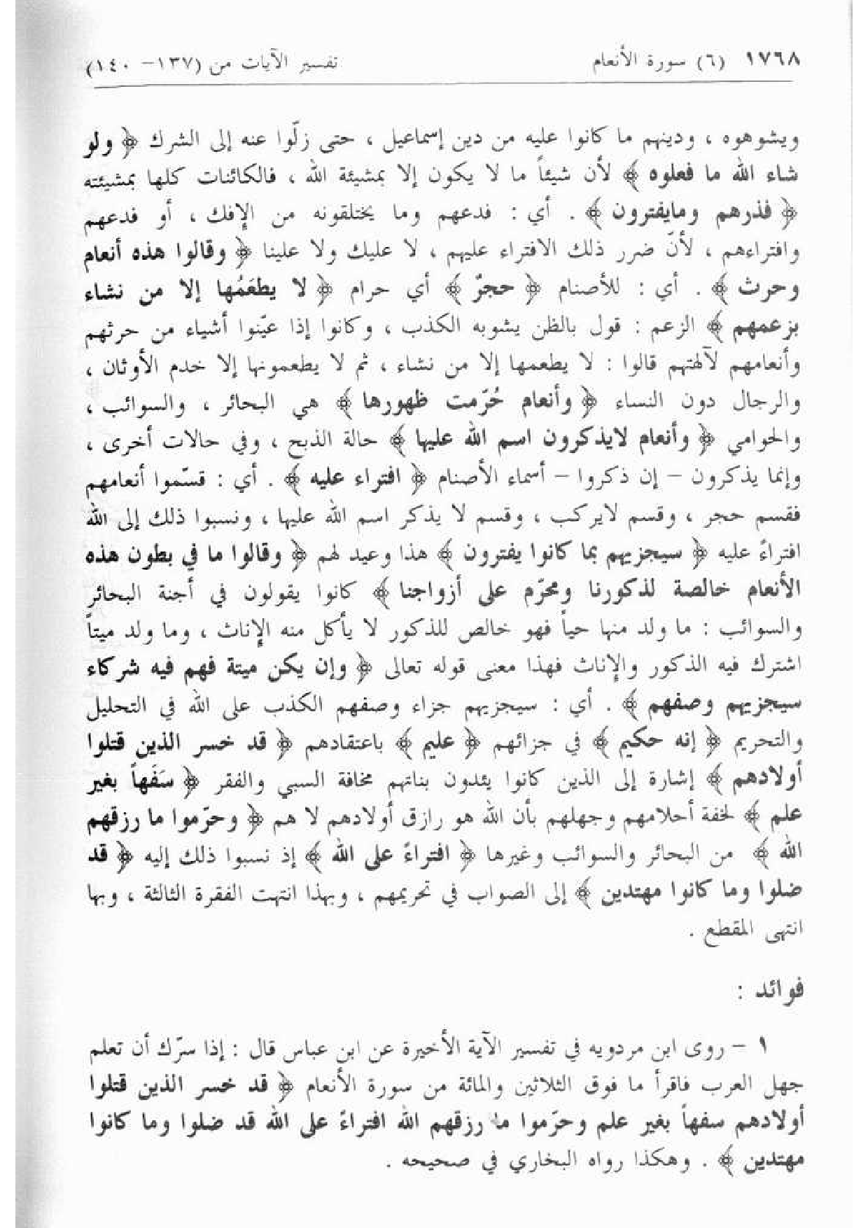 1 - روى ابن مردويه في تفسير الآية الأخيرة عن ابن عباس قال: إذا سرّك أن تعلم جهل العرب فاقرأ ما فوق الثلاثين والمائة من سورة الأنعام قَدْ خَسِرَ الَّذِينَ قَتَلُوا أَوْلادَهُمْ سَفَهاً بِغَيْرِ عِلْمٍ وَحَرَّمُوا ما رَزَقَهُمُ اللَّهُ افْتِراءً عَلَى اللَّهِ قَدْ ضَلُّوا وَما كانُوا مُهْتَدِينَ. وهكذا رواه البخاري في صحيحه.