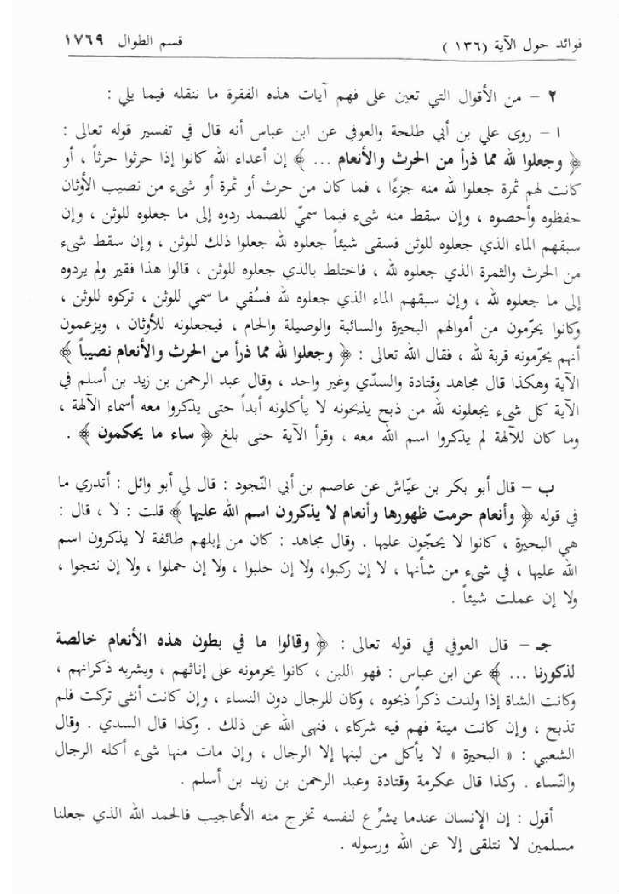 ج- قال العوفي في قوله تعالى: وَقالُوا ما فِي بُطُونِ هذِهِ الْأَنْعامِ خالِصَةٌ لِذُكُورِنا ... عن ابن عباس: فهو اللبن، كانوا يحرمونه على إناثهم، ويشربه ذكرانهم، وكانت الشاة إذا ولدت ذكرا ذبحوه، وكان للرجال دون النساء، وإن كانت أنثى تركت فلم تذبح، وإن كانت ميتة فهم فيه شركاء، فنهى الله عن ذلك. وكذا قال السدي. وقال الشعبي: «البحيرة» لا يأكل من لبنها إلا الرجال، وإن مات منها شئ أكله الرجال والنّساء. وكذا قال عكرمة وقتادة وعبد الرحمن بن زيد بن أسلم.