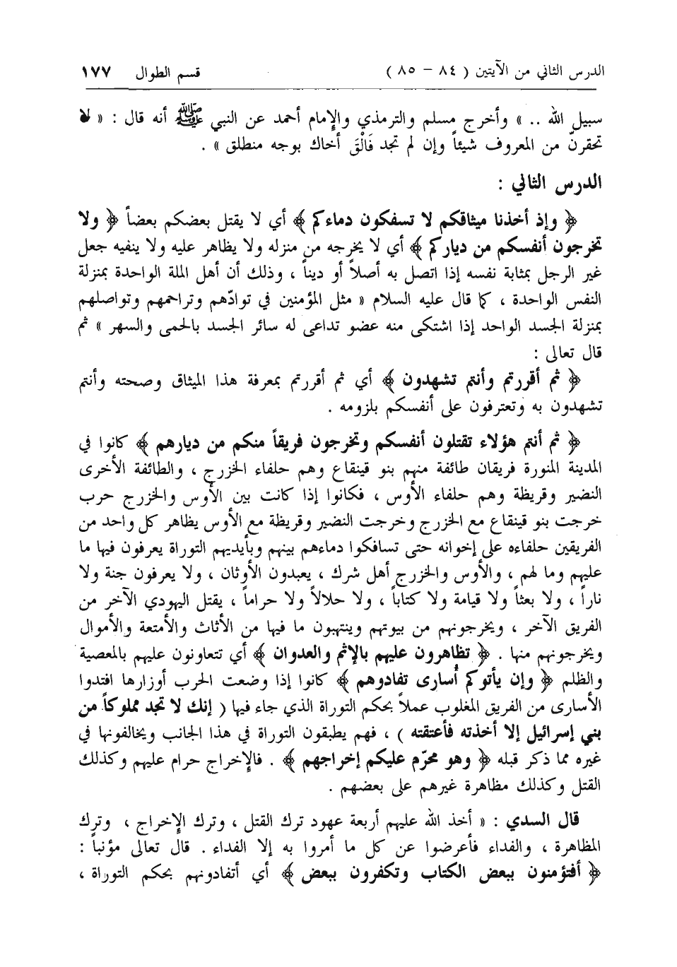 ثُمَّ أَنْتُمْ هؤُلاءِ تَقْتُلُونَ أَنْفُسَكُمْ وَتُخْرِجُونَ فَرِيقاً مِنْكُمْ مِنْ دِيارِهِمْ كانوا في المدينة المنورة فريقان طائفة منهم بنو قينقاع وهم حلفاء الخزرج، والطائفة الأخرى النضير وقريظة وهم حلفاء الأوس، فكانوا إذا كانت بين الأوس والخزرج حرب خرجت بنو قينقاع مع الخزرج وخرجت النضير وقريظة مع الأوس يظاهر كل واحد من الفريقين حلفاءه على إخوانه حتى تسافكوا دماءهم بينهم وبأيديهم التوراة يعرفون فيها ما عليهم وما لهم، والأوس والخزرج أهل شرك، يعبدون الأوثان، ولا يعرفون جنة ولا نارا، ولا بعثا ولا قيامة ولا كتابا، ولا حلالا ولا حراما، يقتل اليهودي الآخر من الفريق الآخر، ويخرجونهم من بيوتهم وينتهبون ما فيها من الأثاث والأمتعة والأموال ويخرجونهم منها. تَظاهَرُونَ عَلَيْهِمْ بِالْإِثْمِ وَالْعُدْوانِ أي تتعاونون عليهم بالمعصية والظلم وَإِنْ يَأْتُوكُمْ أُسارى تُفادُوهُمْ كانوا إذا وضعت الحرب أوزارها افتدوا الأسارى من الفريق المغلوب عملا بحكم التوراة الذي جاء فيها (إنك لا تجد مملوكا من بني إسرائيل إلا أخذته فأعتقته)، فهم يطبقون التوراة في هذا الجانب ويخالفونها في غيره مما ذكر قبله وَهُوَ مُحَرَّمٌ عَلَيْكُمْ إِخْراجُهُمْ. فالإخراج حرام عليهم وكذلك القتل وكذلك مظاهرة غيرهم على بعضهم.