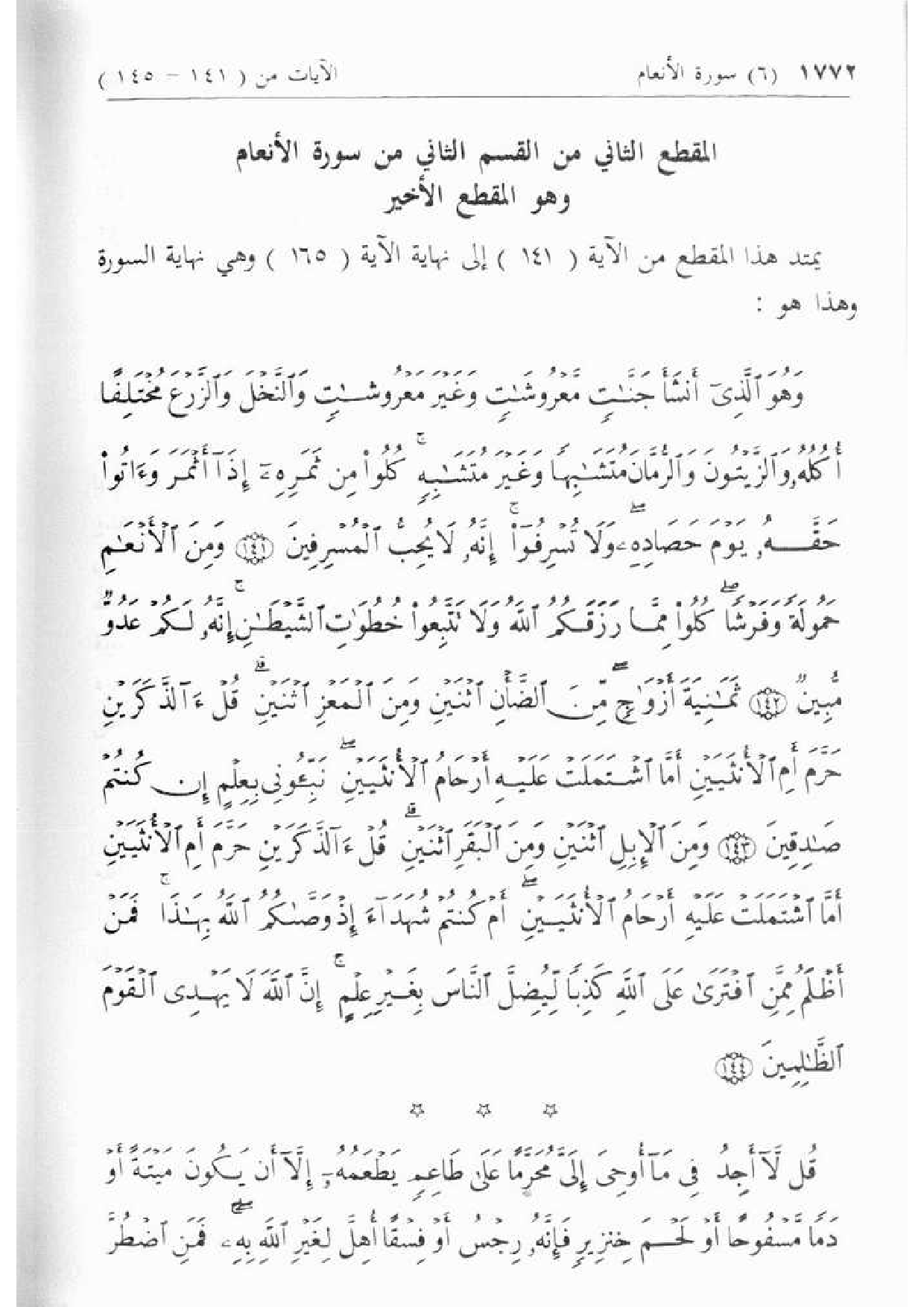 المقطع الثاني من القسم الثاني من سورة الأنعام وهو المقطع الأخير يمتد هذا المقطع من الآية (141) إلى نهاية الآية (165) وهي نهاية السورة وهذا هو: