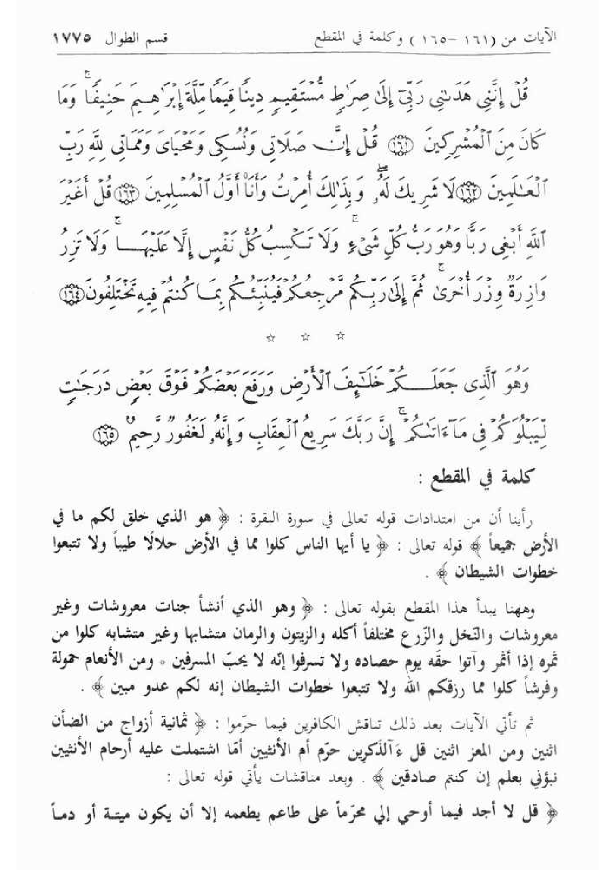 وهاهنا يبدأ هذا المقطع بقوله تعالى: وَهُوَ الَّذِي أَنْشَأَ جَنَّاتٍ مَعْرُوشاتٍ وَغَيْرَ مَعْرُوشاتٍ وَالنَّخْلَ وَالزَّرْعَ مُخْتَلِفاً أُكُلُهُ وَالزَّيْتُونَ وَالرُّمَّانَ مُتَشابِهاً وَغَيْرَ مُتَشابِهٍ كُلُوا مِنْ ثَمَرِهِ إِذا أَثْمَرَ وَآتُوا حَقَّهُ يَوْمَ حَصادِهِ وَلا تُسْرِفُوا إِنَّهُ لا يُحِبُّ الْمُسْرِفِينَ* وَمِنَ الْأَنْعامِ حَمُولَةً وَفَرْشاً كُلُوا مِمَّا رَزَقَكُمُ اللَّهُ وَلا تَتَّبِعُوا خُطُواتِ الشَّيْطانِ إِنَّهُ لَكُمْ عَدُوٌّ مُبِينٌ.