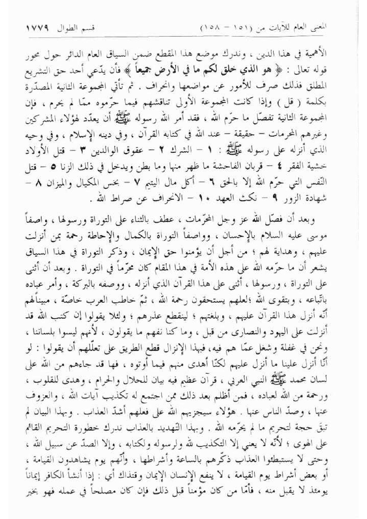 الأهمية في هذا الدين، وندرك موضع هذا المقطع ضمن السياق العام الدائر حول محور قوله تعالى: هُوَ الَّذِي خَلَقَ لَكُمْ ما فِي الْأَرْضِ جَمِيعاً فإن يدّعي أحد حق التشريع المطلق فذلك صرف للأمور عن مواضعها وانحراف. ثم تأتي المجموعة الثانية المصدّرة بكلمة (قل) وإذا كانت المجموعة الأولى تناقشهم فيما حرّموه ممّا لم يحرم، فإن المجموعة الثانية تفصّل ما حرّم الله، فقد أمر الله رسوله صلّى الله عليه وسلّم أن يعدّد لهؤلاء المشركين وغيرهم المحرمات- حقيقة- عند الله في كتابه القرآن، وفي دينه الإسلام، وفي وحيه الذي أنزله على رسوله صلّى الله عليه وسلّم: 1 - الشرك 2 - عقوق الوالدين 3 - قتل الأولاد خشية الفقر 4 - قربان الفاحشة ما ظهر منها وما بطن ويدخل في ذلك الزنا 5 - قتل النّفس التي حرّم الله إلا بالحق 6 - أكل مال اليتيم 7 - بخس المكيال والميزان 8 - شهادة الزور 9 - نكث العهد 10 - الانحراف عن صراط الله.