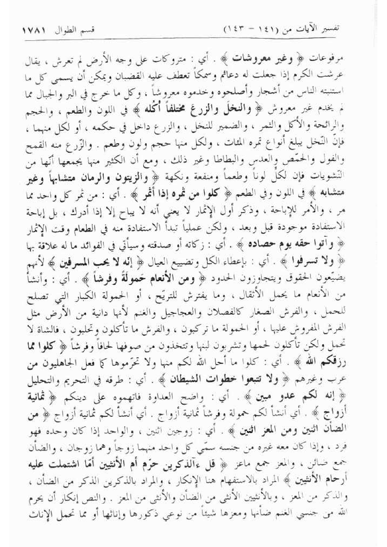 مرفوعات وَغَيْرَ مَعْرُوشاتٍ. أي: متروكات على وجه الأرض لم تعرش، يقال عرشت الكرم إذا جعلت له دعائم وسمكا تعطف عليه القضبان ويمكن أن يسمى كل ما استنبته الناس من أشجار وأصلحوه وخدموه معروشا، وكل ما خرج في البر والجبال مما لم يخدم غير معروش وَالنَّخْلَ وَالزَّرْعَ مُخْتَلِفاً أُكُلُهُ في اللون والطعم، والحجم والرائحة والأكل والثمر، والضمير للنخل، والزرع داخل في حكمه، أو لكل منهما، فإنّ النّخل يبلغ أنواع تمره المئات، ولكل منها حجم ولون وطعم. والزّرع منه القمح والفول والحمّص والعدس والبطاطا وغير ذلك، ومع أن الكثير منها يجمعها أنّها من النّشويات فإن لكلّ لونا وطعما ومنفعة ونكهة وَالزَّيْتُونَ وَالرُّمَّانَ مُتَشابِهاً وَغَيْرَ مُتَشابِهٍ في اللون وفي الطعم كُلُوا مِنْ ثَمَرِهِ إِذا أَثْمَرَ. أي: من ثمر كل واحد مما مر، والأمر للإباحة، وذكر أول الإثمار لا يعني أنه لا يباح إلا إذا أدرك، بل إباحة الاستفادة موجودة قبل وبعد، ولكن عمليا تبدأ الاستفادة منه في الطعام وقت الإثمار وَآتُوا حَقَّهُ يَوْمَ حَصادِهِ. أي: زكاته أو صدقته وسيأتي في الفوائد ما له علاقة بها وَلا تُسْرِفُوا. أي: بإعطاء الكل وتضييع العيال إِنَّهُ لا يُحِبُّ الْمُسْرِفِينَ لأنهم يضيّعون الحقوق ويتجاوزون الحدود