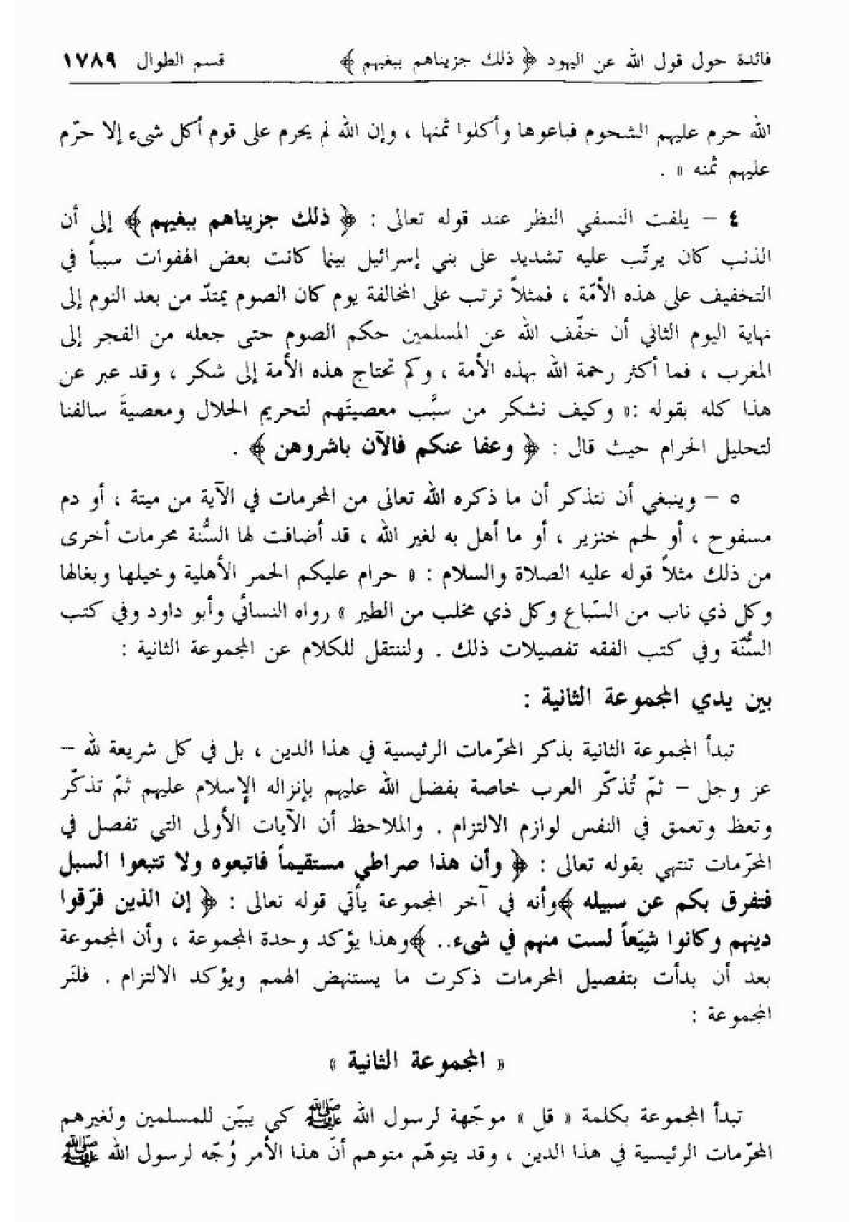 5 - وينبغي أن نتذكر أن ما ذكره الله تعالى من المحرمات في الآية من ميتة، أو دم مسفوح، أو لحم خنزير، أو ما أهل به لغير الله، قد أضافت لها السّنة محرمات أخرى من ذلك مثلا قوله عليه الصلاة والسلام: «حرام عليكم الحمر الأهلية وخيلها وبغالها وكل ذي ناب من السّباع وكل ذي مخلب من الطير» رواه النسائي وأبو داود وفي كتب السّنّة وفي كتب الفقه تفصيلات ذلك. ولننتقل للكلام عن المجموعة الثانية: