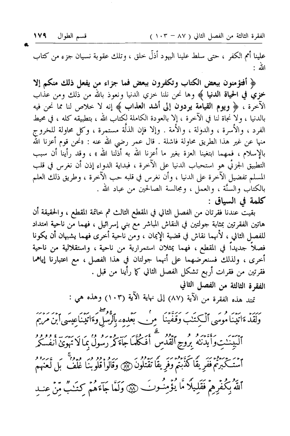 بقيت عندنا فقرتان من الفصل الثاني في المقطع الثالث ثم خاتمة المقطع، والحقيقة أن هاتين الفقرتين بمثابة جولتين في النقاش المباشر مع بني إسرائيل، فهما من ناحية امتداد للفصل الثاني، لأنهما نقاش في قضية الإيمان، ومن ناحية أخرى فهما يشبهان أن يكونا فصلا جديدا في المقطع، فهما يمثلان استمرارية من ناحية، واستقلالية من ناحية أخرى، ولذلك فسنعرضهما على أنهما جولتان في هذا الفصل، مع اعتبارنا إياهما فقرتين من فقرات أربع تشكل الفصل الثاني كما رأينا من قبل.