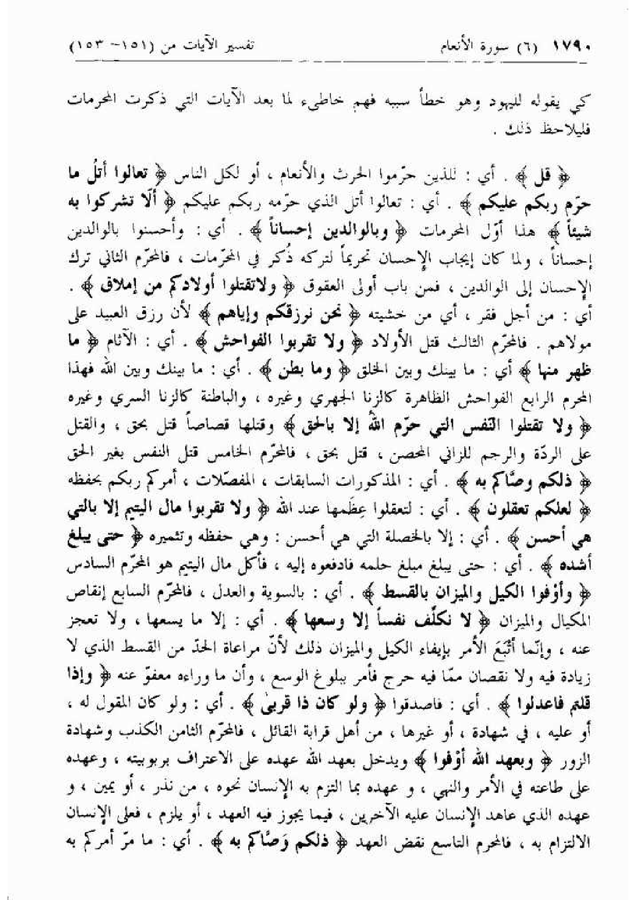 وَلا تَقْرَبُوا مالَ الْيَتِيمِ إِلَّا بِالَّتِي هِيَ أَحْسَنُ. أي: إلا بالخصلة التي هي أحسن: وهي حفظه وتثميره حَتَّى يَبْلُغَ أَشُدَّهُ. أي: حتى يبلغ مبلغ حلمه فادفعوه إليه، فأكل مال اليتيم هو المحرّم السادس وَأَوْفُوا الْكَيْلَ وَالْمِيزانَ بِالْقِسْطِ. أي: بالسوية والعدل، فالمحرّم السابع إنقاص المكيال والميزان لا نُكَلِّفُ نَفْساً إِلَّا وُسْعَها. أي: إلا ما يسعها، ولا تعجز عنه، وإنّما أتبع الأمر بإيفاء الكيل والميزان ذلك لأنّ مراعاة الحدّ من القسط الذي لا زيادة فيه ولا نقصان ممّا فيه حرج فأمر ببلوغ الوسع، وأن ما وراءه معفوّ عنه وَإِذا قُلْتُمْ فَاعْدِلُوا. أي: فاصدقوا وَلَوْ كانَ ذا قُرْبى. أي: ولو كان المقول له، أو عليه، في شهادة، أو غيرها، من أهل قرابة القائل، فالمحرّم الثامن الكذب وشهادة الزور وَبِعَهْدِ اللَّهِ أَوْفُوا ويدخل بعهد الله عهده على الاعتراف بربوبيته، وعهده على طاعته في الأمر والنهي، وعهده بما التزم به الإنسان نحوه، من نذر، أو يمين، وعهده الذي عاهد الإنسان عليه الآخرين، فيما يجوز فيه العهد، أو يلزم، فعلى الإنسان الالتزام به، فالمحرم التاسع نقض العهد ذلِكُمْ وَصَّاكُمْ بِهِ. أي: ما مرّ أمركم به
