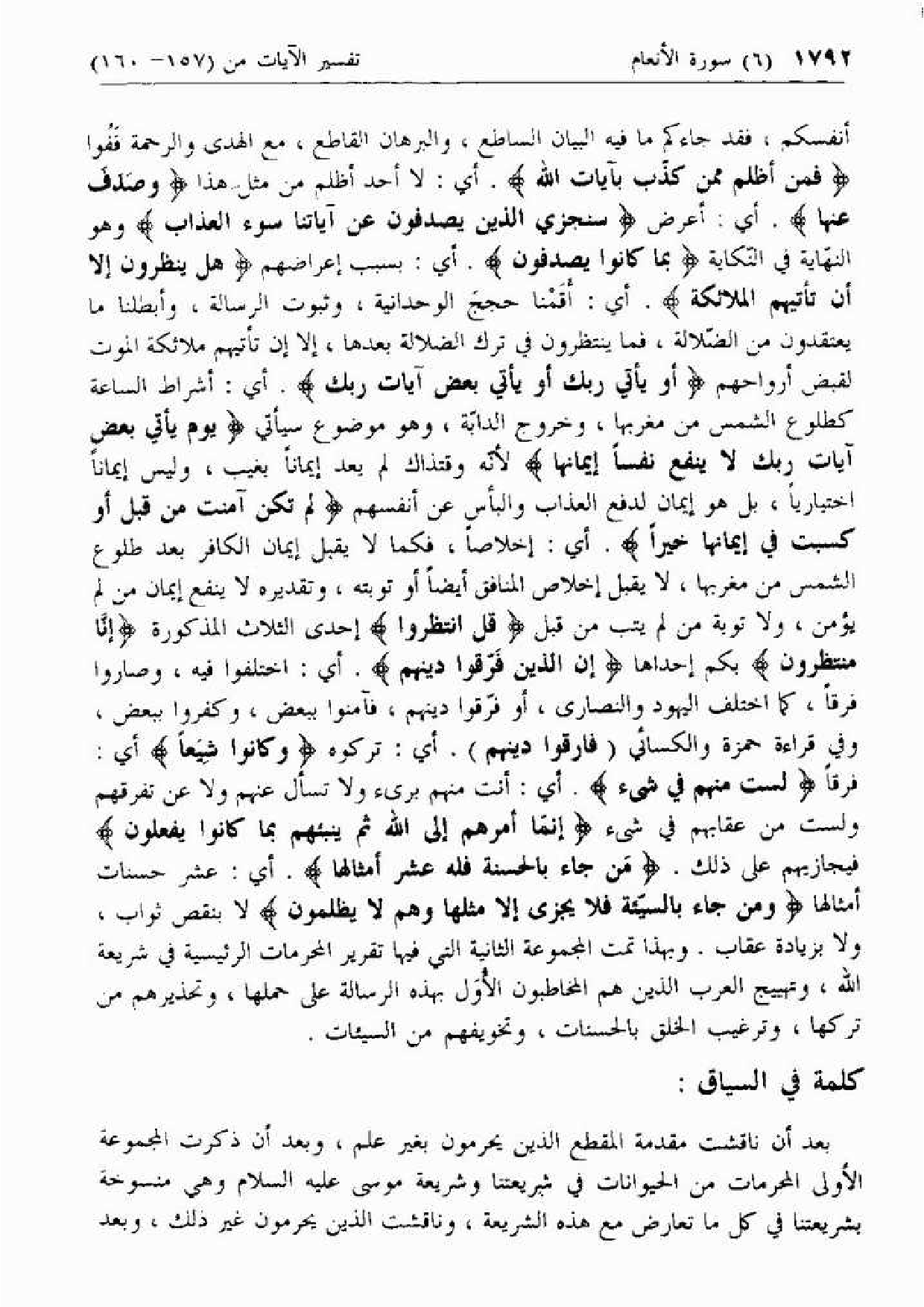 مَنْ جاءَ بِالْحَسَنَةِ فَلَهُ عَشْرُ أَمْثالِها. أي: عشر حسنات أمثالها وَمَنْ جاءَ بِالسَّيِّئَةِ فَلا يُجْزى إِلَّا مِثْلَها وَهُمْ لا يُظْلَمُونَ لا بنقص ثواب، ولا بزيادة عقاب. وبهذا تمت المجموعة الثانية التي فيها تقرير المحرمات الرئيسية في شريعة الله، وتهييج العرب الذين هم المخاطبون الأول بهذه الرسالة على حملها، وتحذيرهم من تركها، وترغيب الخلق بالحسنات، وتخويفهم من السيئات.