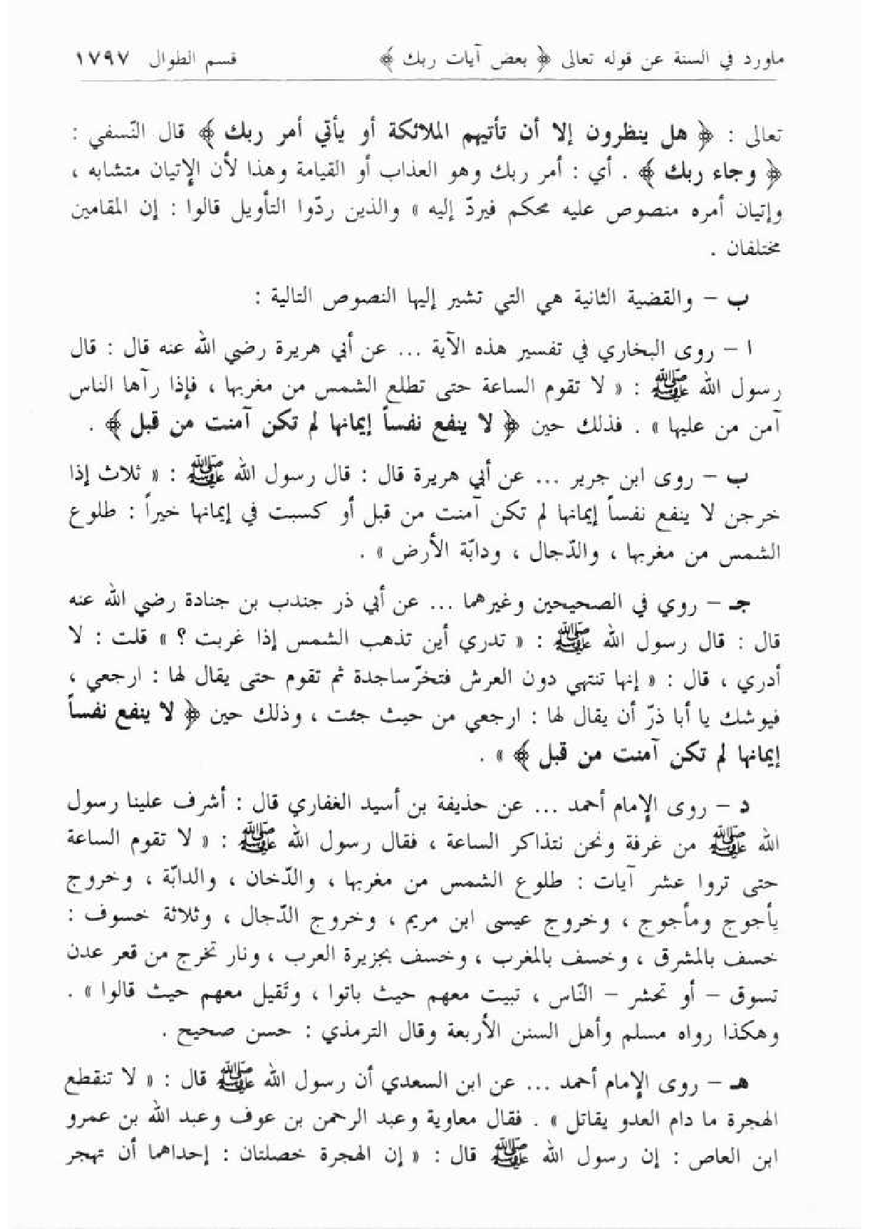 ا- روى البخاري في تفسير هذه الآية ... عن أبي هريرة رضي الله عنه قال: قال رسول الله صلّى الله عليه وسلّم: «لا تقوم الساعة حتى تطلع الشمس من مغربها، فإذا رآها الناس آمن من عليها». فذلك حين لا يَنْفَعُ نَفْساً إِيمانُها لَمْ تَكُنْ آمَنَتْ مِنْ قَبْلُ.