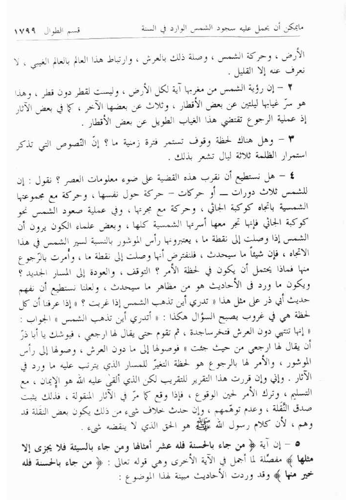 4 - هل نستطيع أن نقرب هذه القضية على ضوء معلومات العصر؟ نقول: إن للشمس ثلاث دورات- أو حركات- حركة حول نفسها، وحركة مع مجموعتها الشمسية باتجاه كوكبة الجاثي، وحركة مع مجرتها، وفي عملية صعود الشمس نحو كوكبة الجاثي فإنها تجر معها أسرتها الشمسية كلها، وبعض علماء الكون يرون أن الشمس إذا وصلت إلى نقطة ما، يعتبرونها رأس الموشور بالنسبة لسير الشمس في هذا الاتجاه، فإن شيئا ما سيحدث، فلنفترض أنها وصلت إلى نقطة ما، وأمرت بالرّجوع منها فماذا يحتمل أن يكون في لحظة الأمر؟ التوقف، والعودة إلى المسار الجديد؟