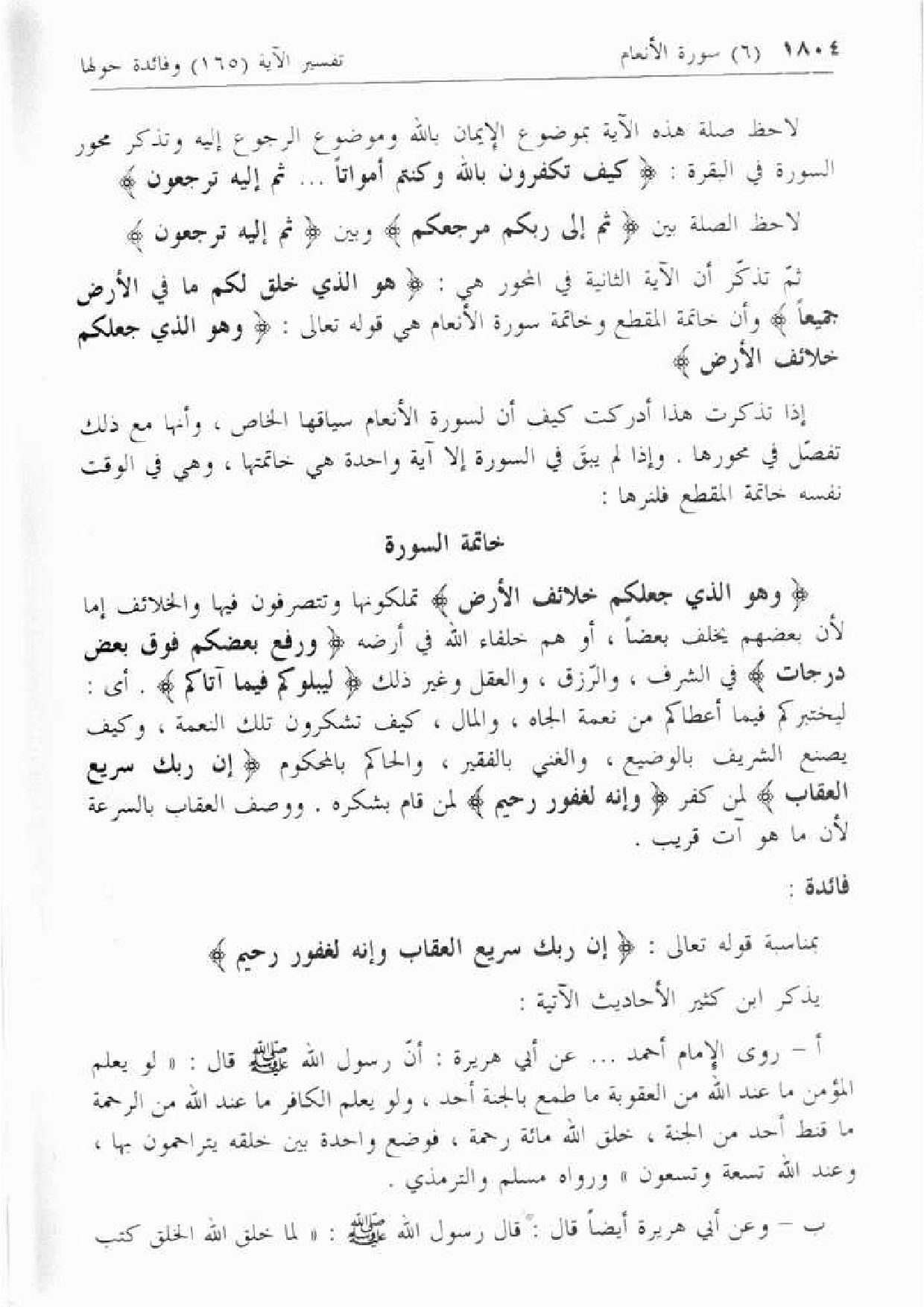إذا تذكرت هذا أدركت كيف أن لسورة الأنعام سياقها الخاص، وأنها مع ذلك تفصّل في محورها. وإذا لم يبق في السورة إلا آية واحدة هي خاتمتها، وهي في الوقت نفسه خاتمة المقطع فلنرها: