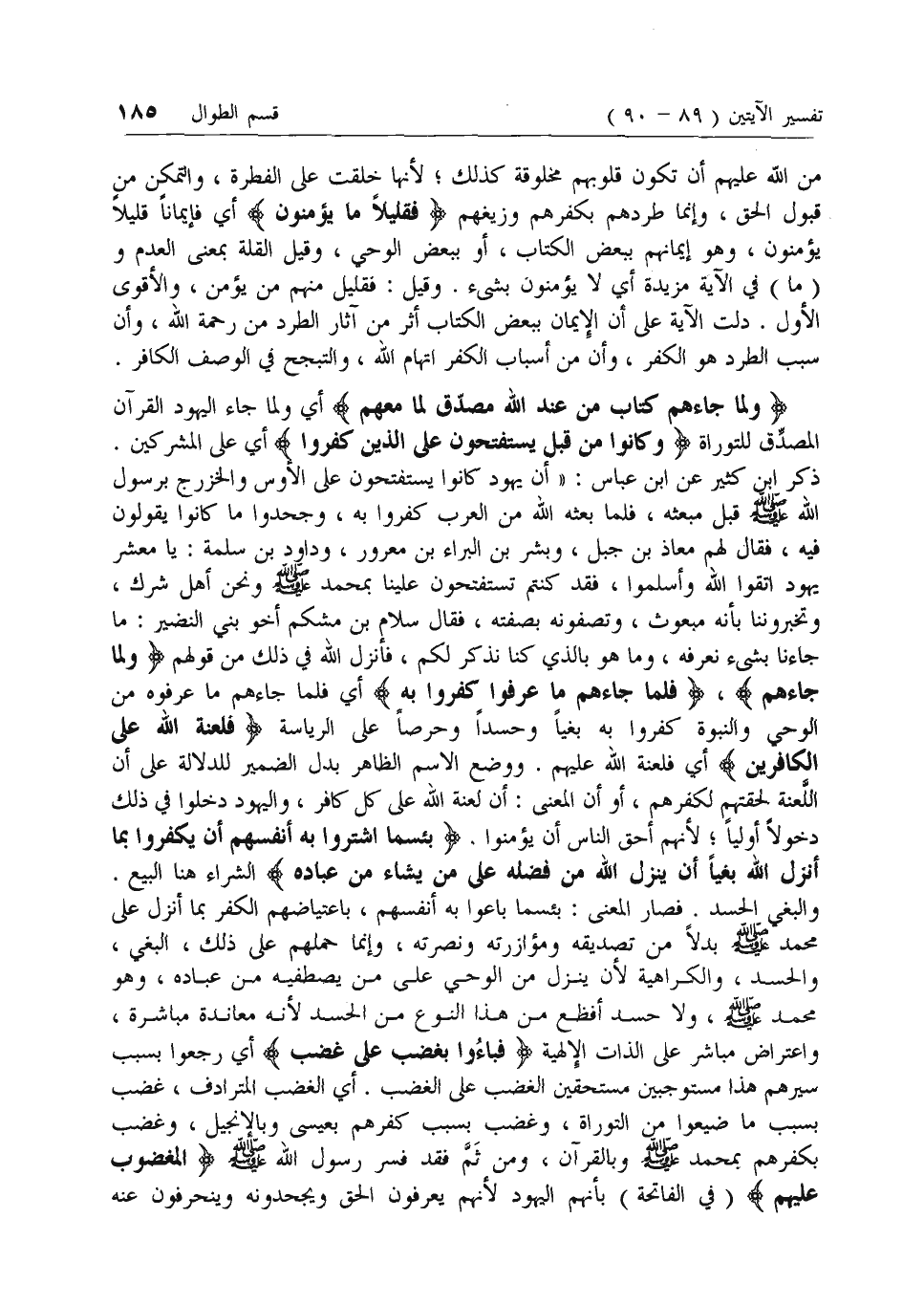 والبغي الحسد. فصار المعنى: بئسما باعوا به أنفسهم، باعتياضهم الكفر بما أنزل على محمد صلى الله عليه وسلم بدلا من تصديقه ومؤازرته ونصرته، وإنما حملهم على ذلك، البغي، والحسد، والكراهية لأن ينزل من الوحي على من يصطفيه من عباده، وهو محمد صلى الله عليه وسلم، ولا حسد أفظع من هذا النوع من الحسد لأنه معاندة مباشرة، واعتراض مباشر على الذات الإلهية فَباؤُ بِغَضَبٍ عَلى غَضَبٍ أي رجعوا بسبب سيرهم هذا مستوجبين مستحقين الغضب على الغضب. أي الغضب المترادف، غضب بسبب ما ضيعوا من التوراة، وغضب بسبب كفرهم بعيسى وبالإنجيل، وغضب بكفرهم بمحمد صلى الله عليه وسلم وبالقرآن، ومن ثم فقد فسر رسول الله صلى الله عليه وسلم الْمَغْضُوبِ عَلَيْهِمْ (في الفاتحة) بأنهم اليهود لأنهم يعرفون الحق ويجحدونه وينحرفون عنه