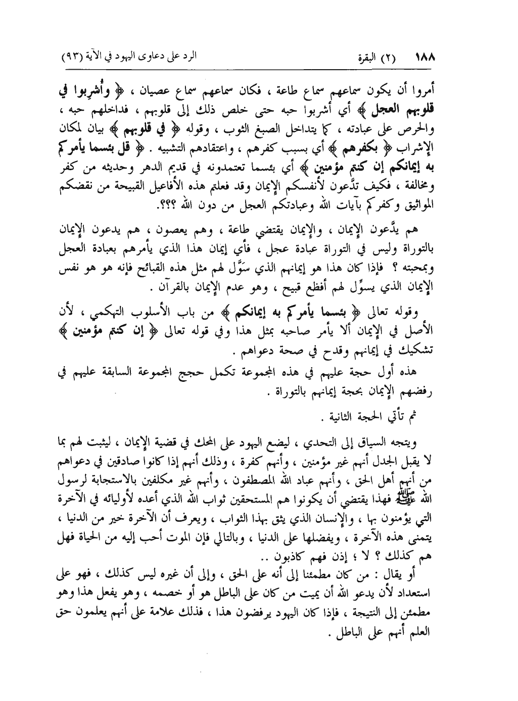 هم يدعون الإيمان، والإيمان يقتضي طاعة، وهم يعصون، هم يدعون الإيمان بالتوراة وليس في التوراة عبادة عجل، فأي إيمان هذا الذي يأمرهم بعبادة العجل وبمحبته؟ فإذا كان هذا هو إيمانهم الذي سول لهم مثل هذه القبائح فإنه هو هو نفس الإيمان الذي يسول لهم أفظع قبيح، وهو عدم الإيمان بالقرآن.